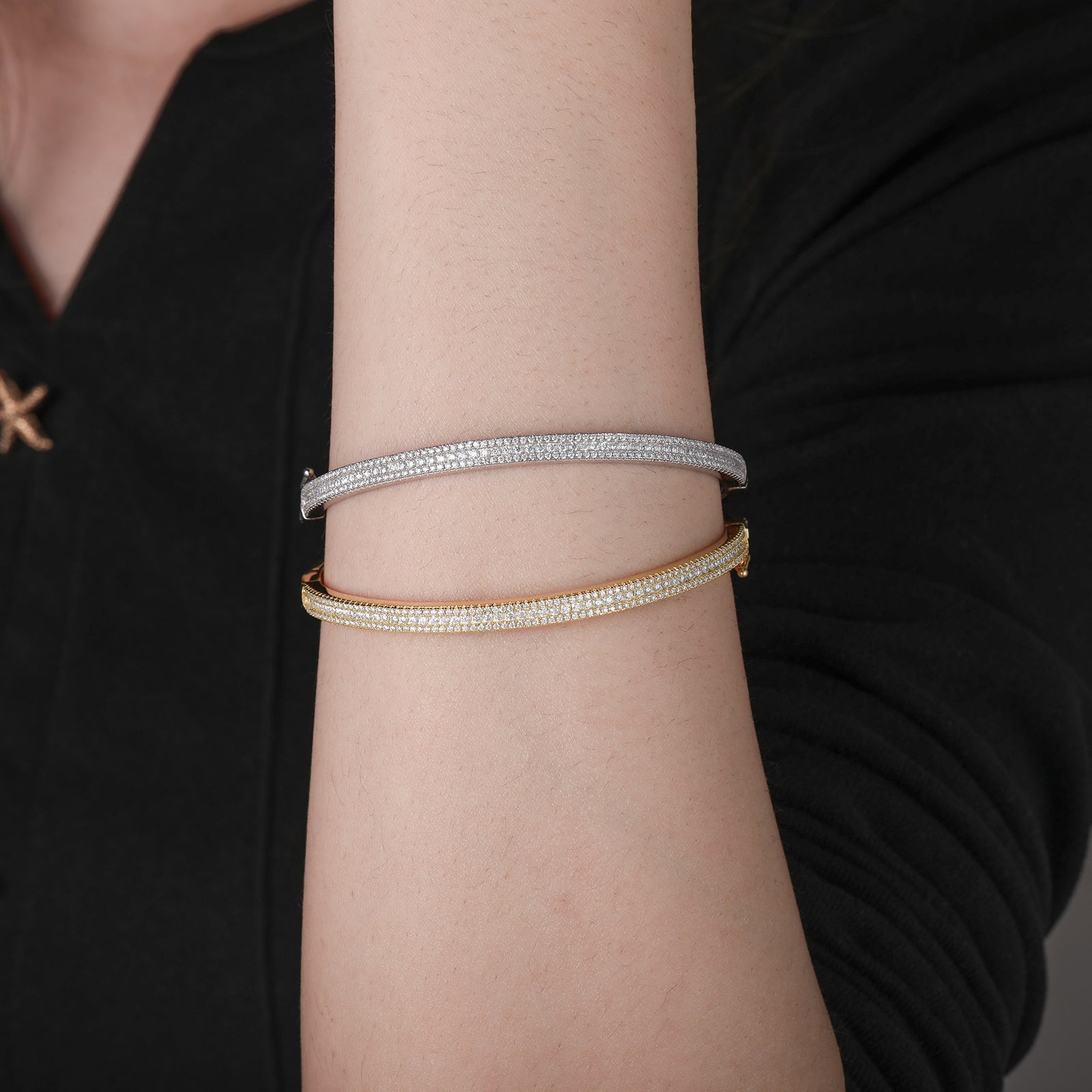 Introducing our 4mm Moissanite Diamond Bangle Bracelet in Sterling Silver, available in 1, 2, or 3 rows. Each bracelet features sparkling moissanite diamonds intricately set in high-quality sterling silver, offering a choice of designs to suit your style preference. Whether you choose the minimalistic elegance of a single row or the enhanced brilliance of multiple rows, this bracelet is perfect for adding sophistication to any outfit. Elevate your jewelry collection with this versatile piece designed to shine and captivate admirers. 💎✨