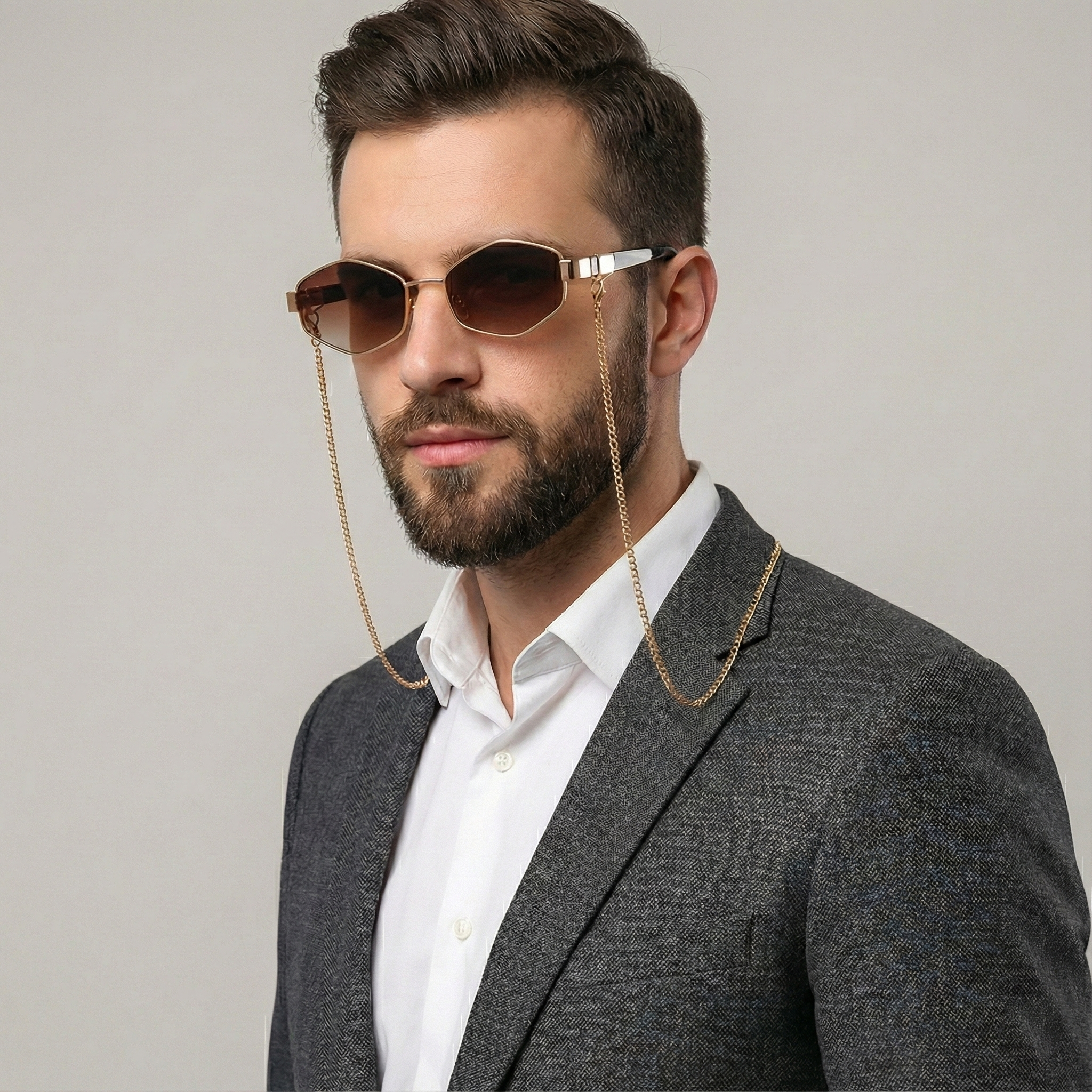 AURELIS retro sunglasses channel timeless elegance through a refined, jewelry-inspired design. Defined by a sculpted gold-tone metal frame, softly angular lenses, and a detachable chain detail, AURELIS blends vintage sophistication with modern luxury. The balanced silhouette evokes classic eyewear heritage while delivering a contemporary, fashion-forward presence.