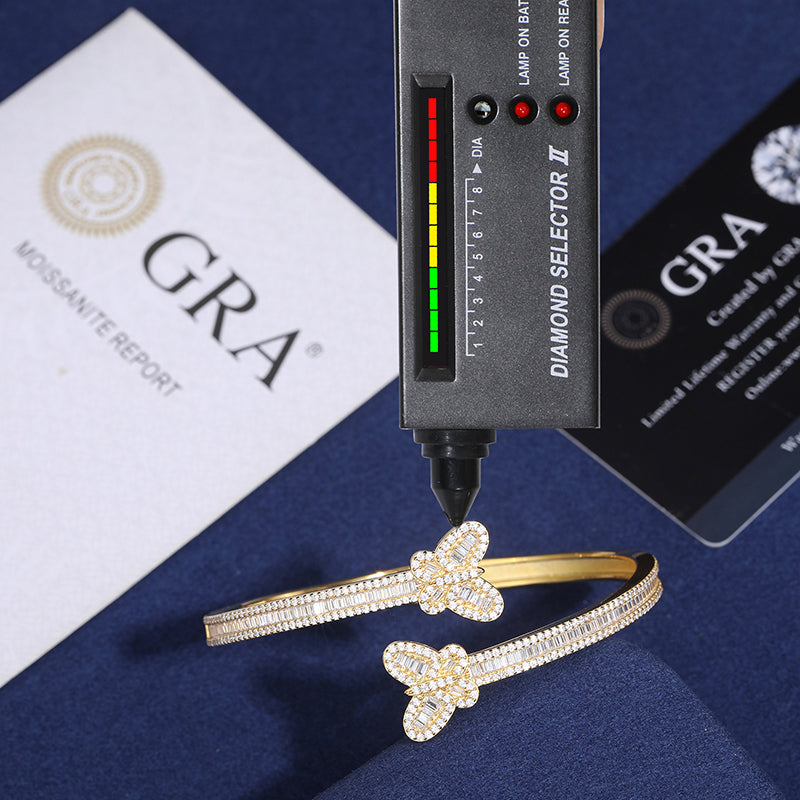 Introducing our Baguette Moissanite Butterfly Bangle Bracelet in Sterling Silver. This exquisite bracelet features a delicate butterfly design, adorned with shimmering baguette-cut moissanite stones. Crafted with precision in sterling silver, it combines elegance with whimsical charm, perfect for adding a touch of sophistication to any ensemble. Ideal for those who appreciate unique and graceful jewelry, this bracelet is designed to captivate and enchant. Elevate your style with this stunning piece, crafted to sparkle and inspire. 💎🦋