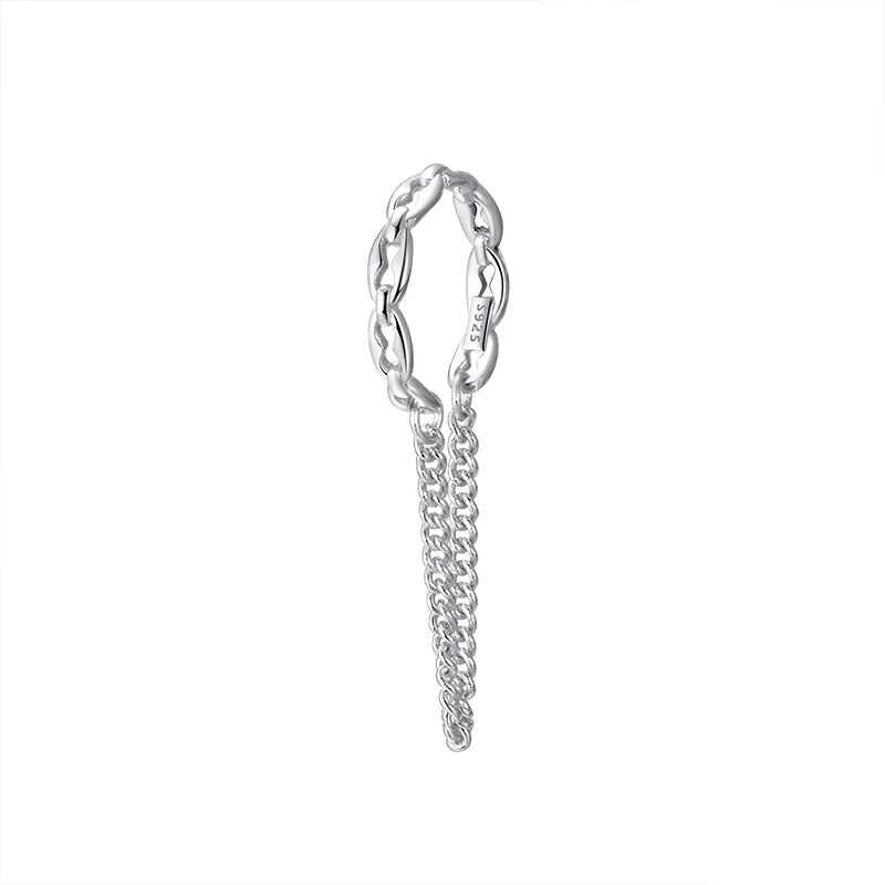 Chain Drop Ear Cuff Earring In Sterling Silver: Sleek, subtle, and made to move, the Chain Drop Ear Cuff Earring adds instant edge without the need for extra piercings. Crafted from high-polish sterling silver, this minimalist cuff hugs the ear while a delicate chain drop brings effortless motion and attitude. Lightweight and comfortable, it’s designed for all-day wear and easy styling—perfect for stacking with studs and hoops or wearing solo for low-key drip.