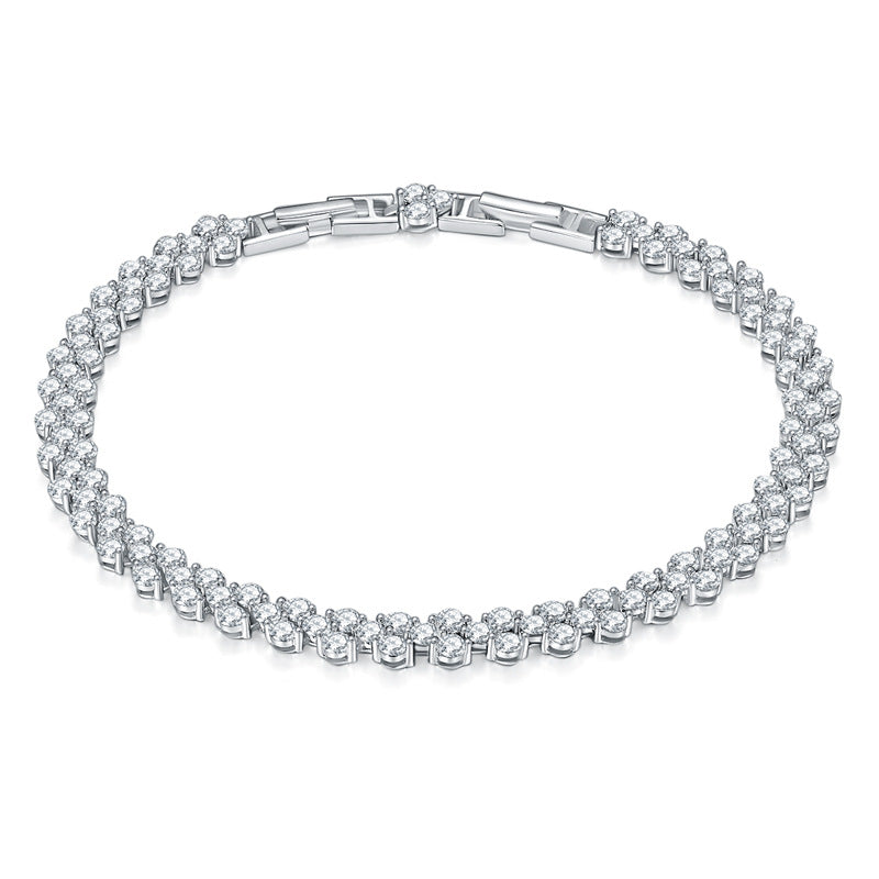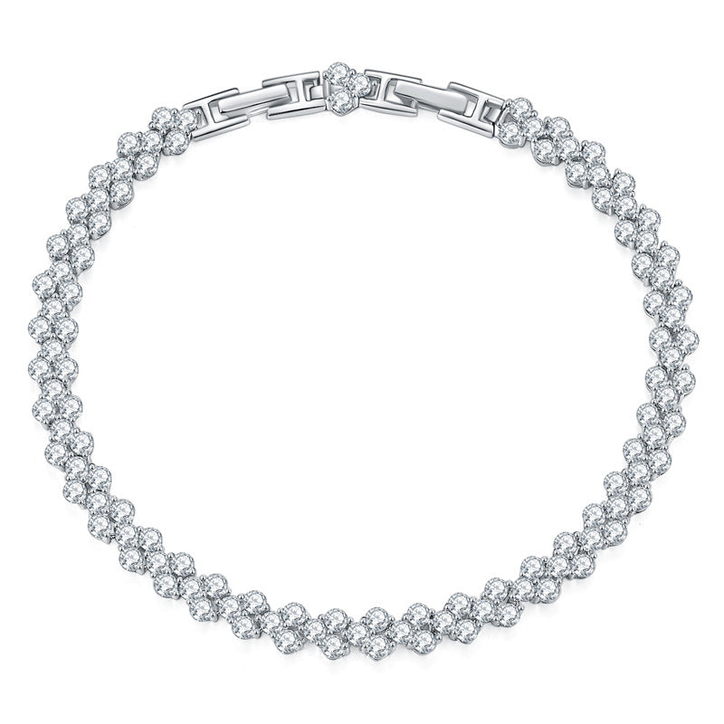 Introducing the IE0043 2.5mm 6.8ct Moissanite Clover Bracelet in Sterling Silver. Elevate your elegance with this stunning bracelet, featuring intricate clover motifs adorned with a dazzling 6.8-carat total weight of moissanite stones. Crafted in sterling silver, it combines timeless charm with modern sophistication. Ideal for adding a touch of luxury to any occasion, this bracelet is perfect for those who appreciate exquisite craftsmanship and sparkling brilliance. Enhance your jewelry collection with this captivating piece that exudes grace and style. 🍀💎
