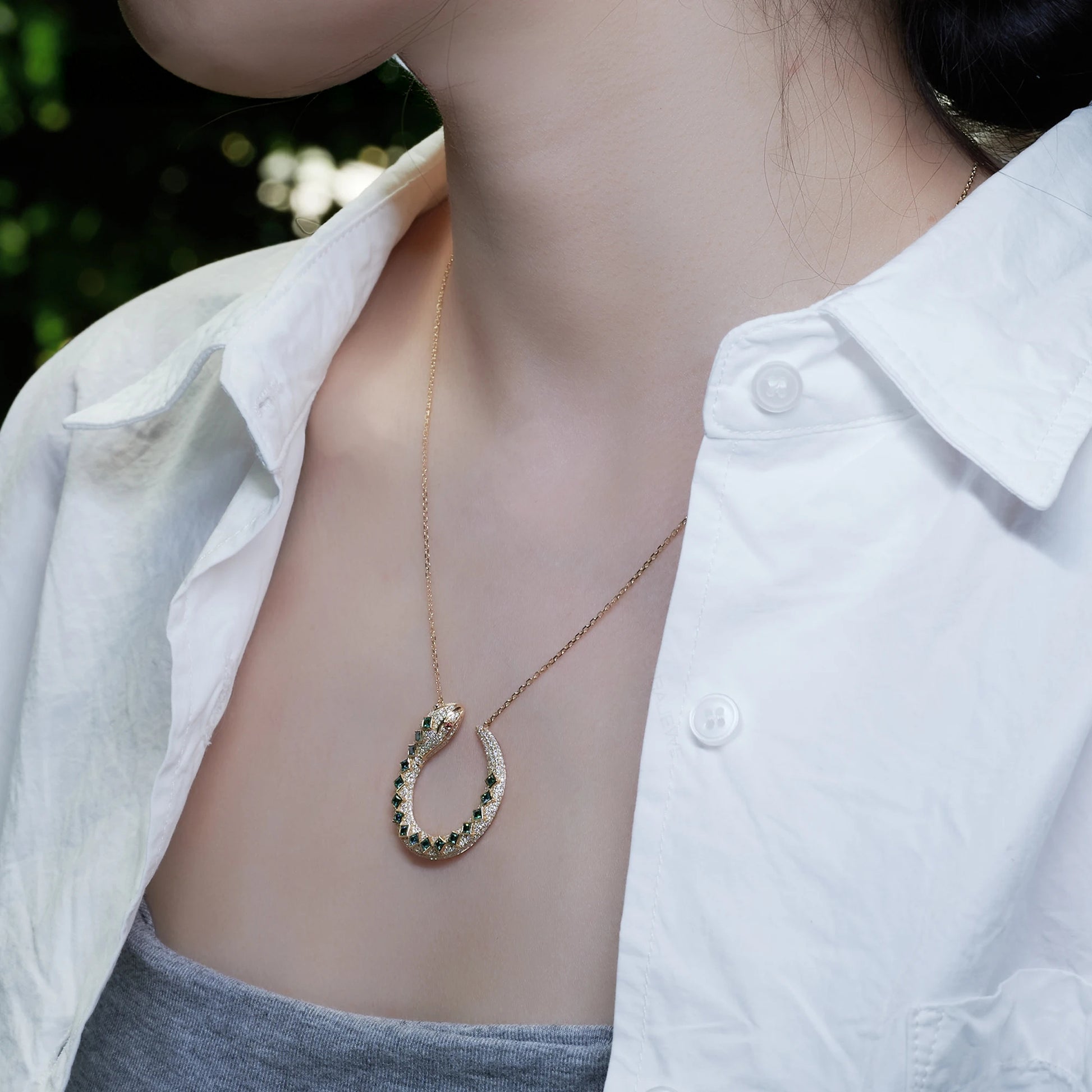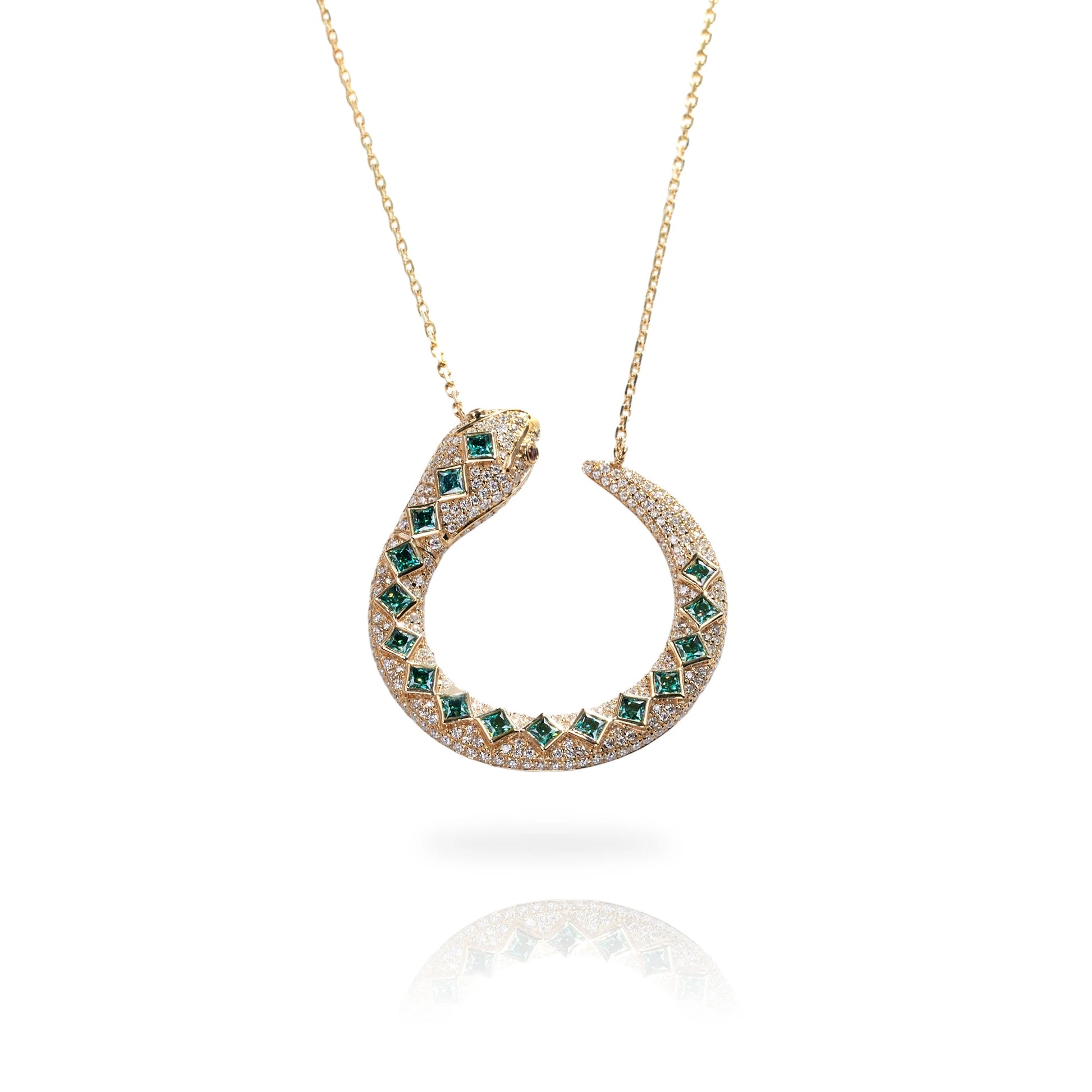 MOISSANITE DIAMOND EMERALD SERPENT PENDANT IN SOLID GOLD