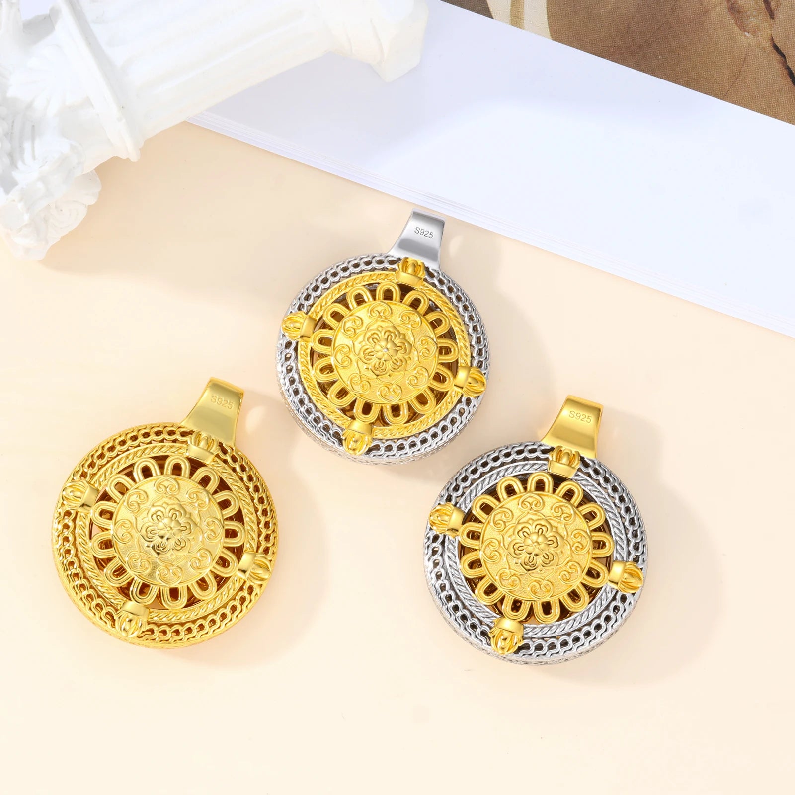 Moissanite Diamond Vintage Spinner Pendant in Sterling Silver: This timeless pendant blends old-world charm with modern sparkle ✨. Crafted in sterling silver, its rotating spinner design adds a playful, interactive touch while shimmering moissanite stones bring brilliant shine. The vintage detailing gives it a classic, heirloom feel, making it a meaningful accessory for daily wear or special moments 💫. A perfect blend of elegance, craftsmanship, and character.