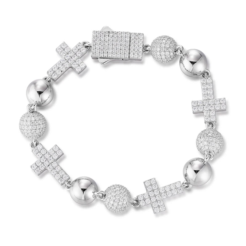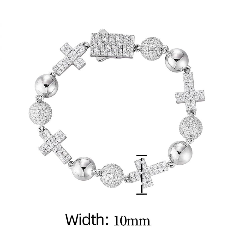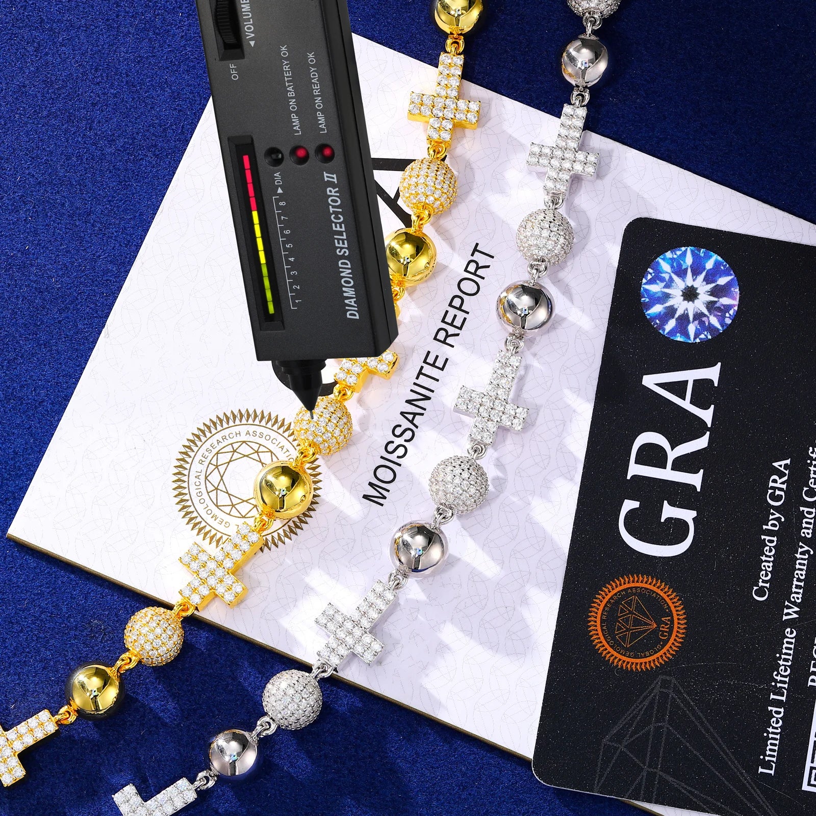 Moissanite Iced Out Ball Cross Link Bracelet in Sterling Silver: This bracelet features bold ball-style links accented with a fully iced-out cross design for maximum shine and street-inspired appeal. Crafted in high-quality sterling silver, the moissanite stones deliver intense, diamond-like brilliance with a solid, premium feel. Designed to stand out, this piece is perfect for statement styling, everyday wear, or adding a bold edge to your jewelry collection.