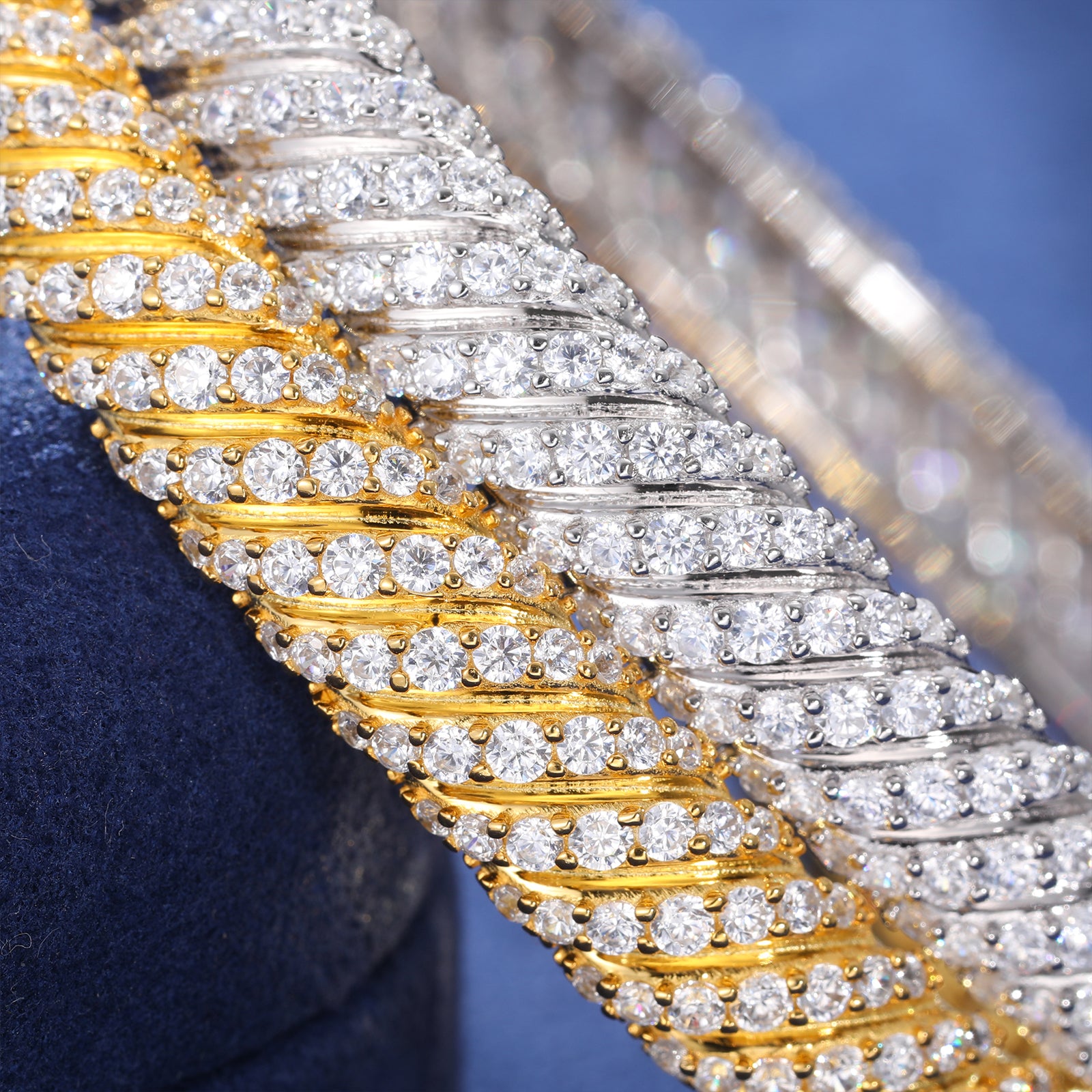 Elevate your accessory game with the Moissanite Diamond Prong Twisted Shape Bangle Bracelet in Sterling Silver. This unique bangle features a captivating twisted design adorned with sparkling VVS Moissanite diamonds, ensuring you shine bright from every angle. Crafted from 925 Sterling Silver and anti-tarnish plated in white gold or 18K gold, it seamlessly blends luxury with durability. Perfect for adding a touch of elegance and hip-hop flair to any outfit. 💎✨