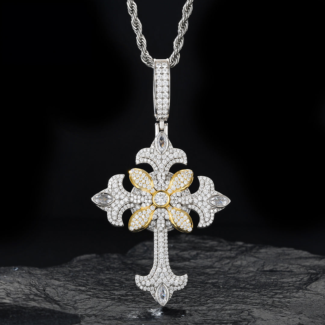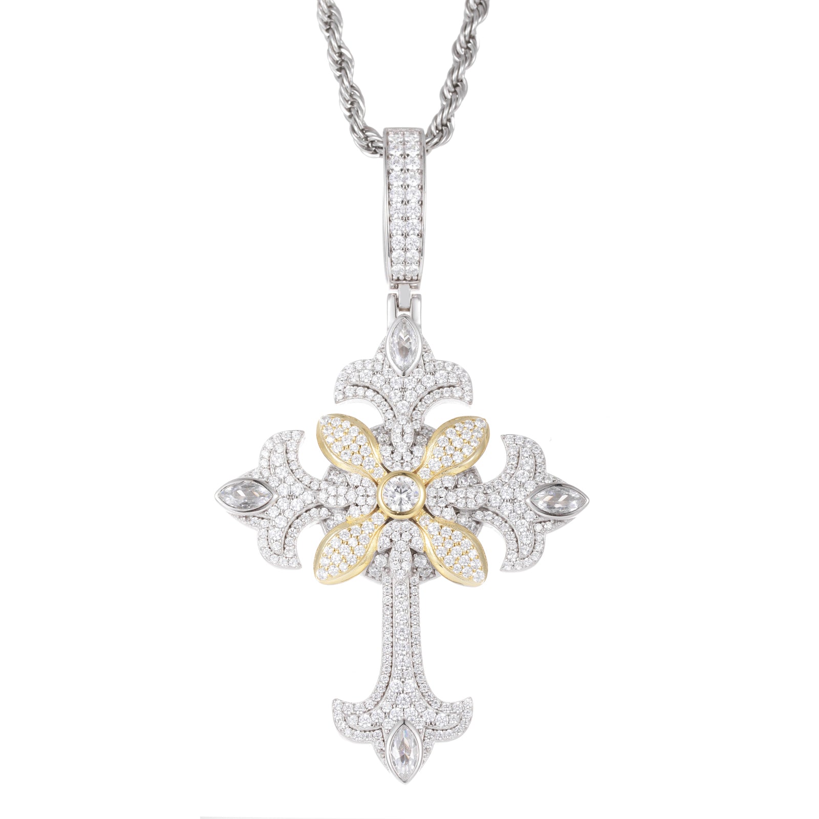 TWO TONE MOISSANITE FLOWER CROSS PENDANT IN STERLING SILVER