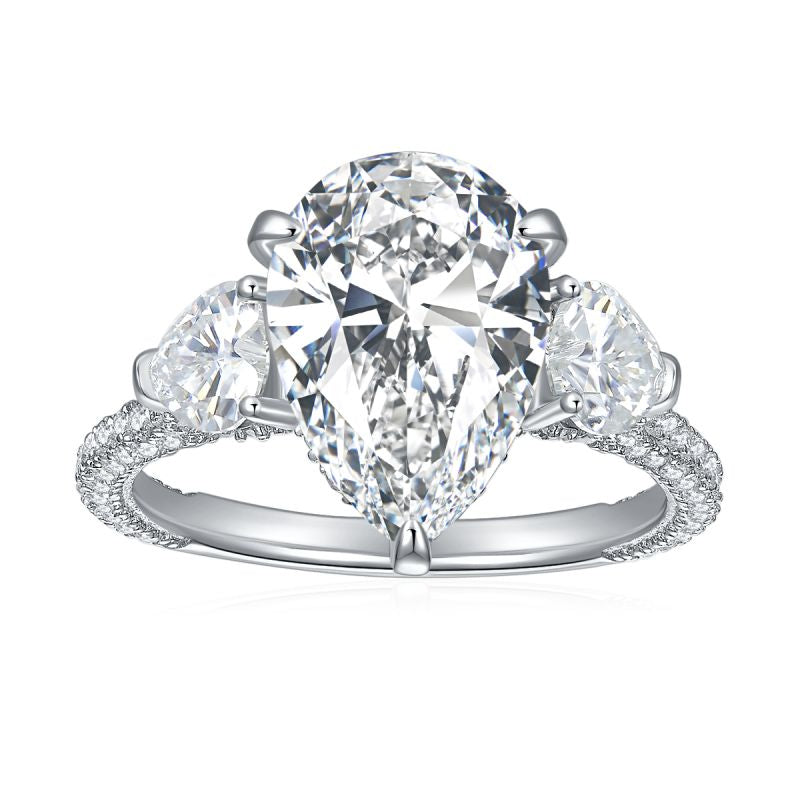 The IE0147 5CT Water Drop Pear Cut Moissanite Diamond Ring in Sterling Silver showcases three stunning moissanite stones, with the central pear-cut stone larger than the two flanking stones. Crafted in high-quality sterling silver, this ring offers a radiant and elegant look. Its anti-tarnish finish ensures enduring beauty, making it an ideal choice for any special occasion. 💍💎