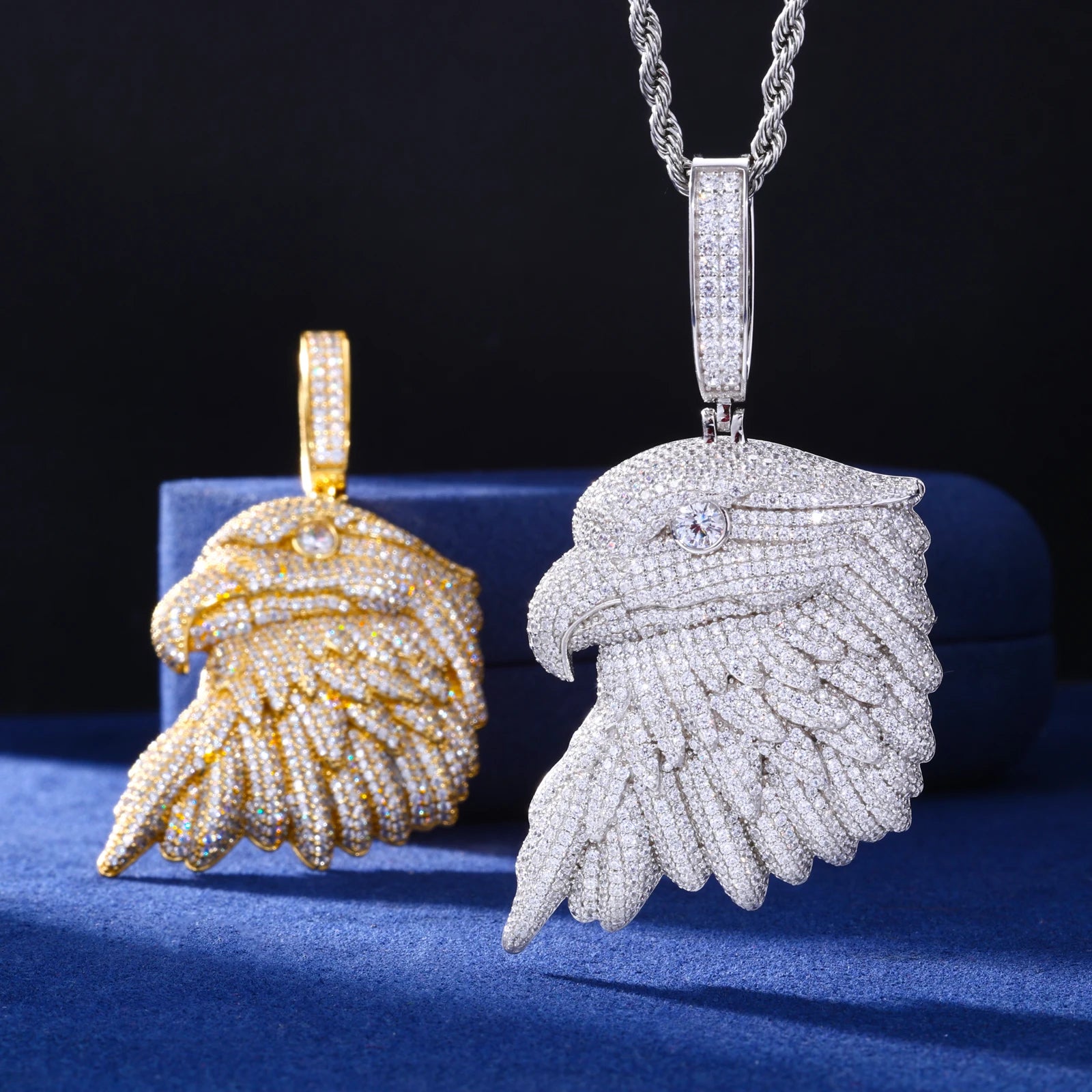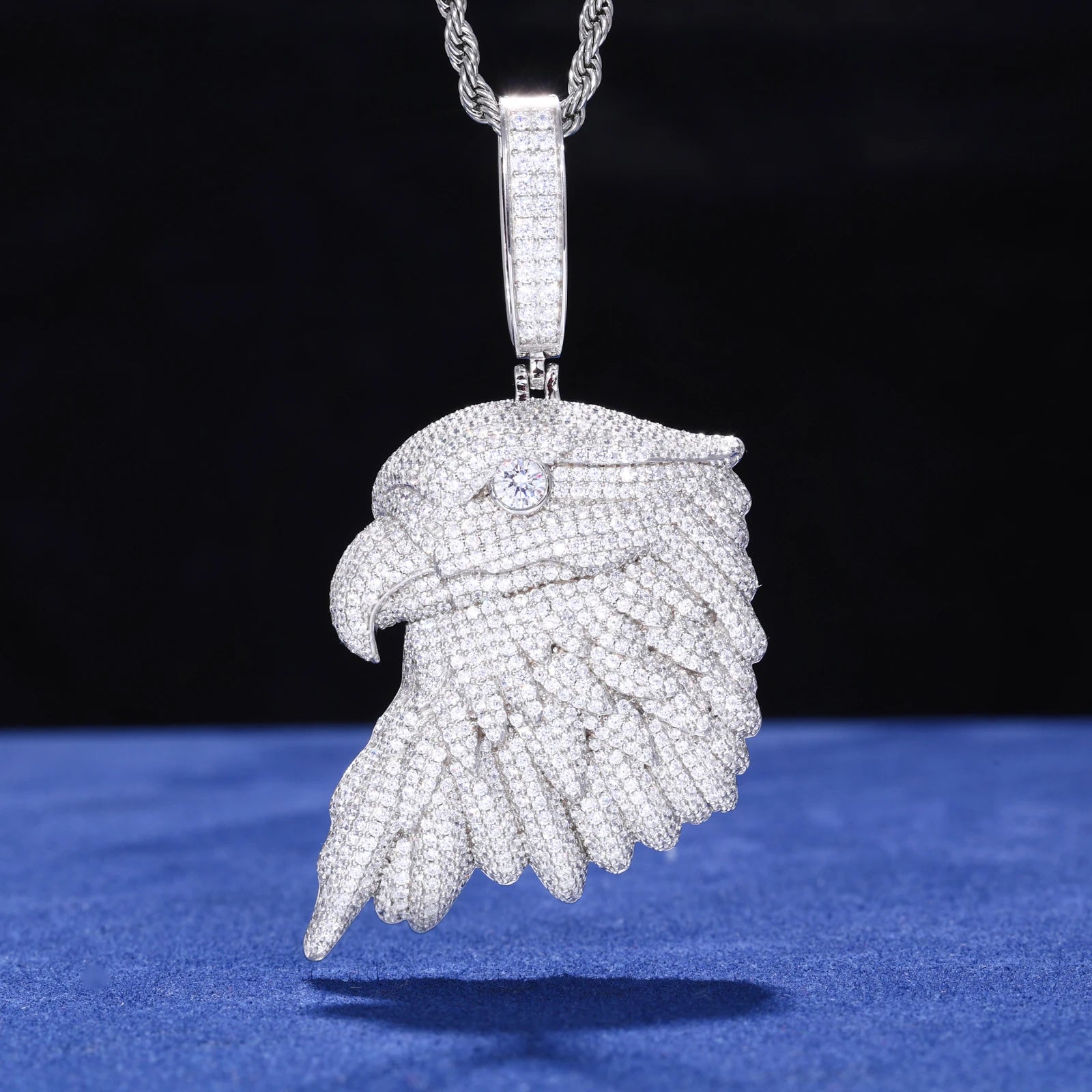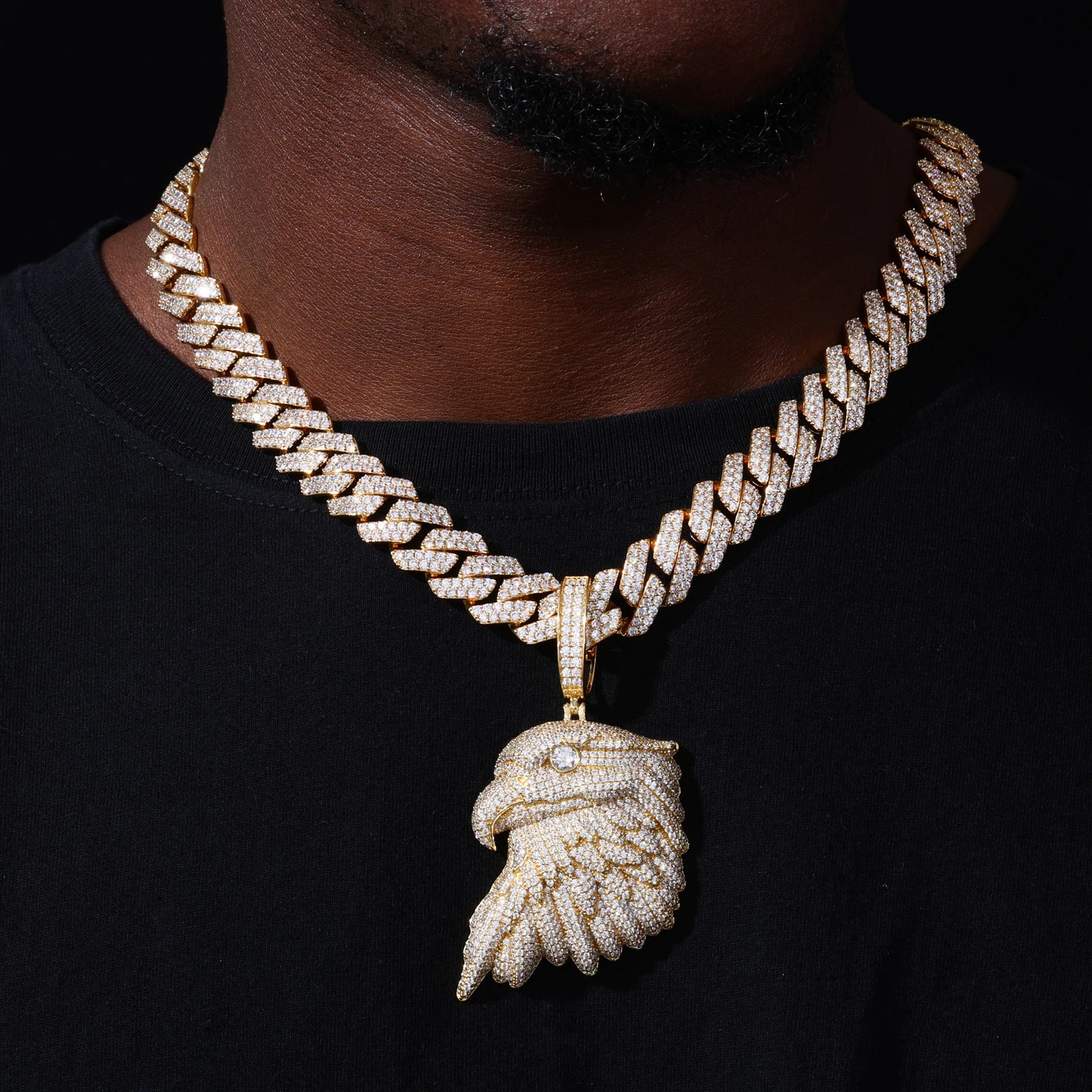 Every feather is sculpted with precision, creating depth and movement, while the eagle’s eye is highlighted to deliver a sharp, commanding presence. The oversized pavé-set bail is also iced with moissanite, ensuring uninterrupted brilliance from chain to centerpiece. Designed to catch light from every angle, this piece delivers a bold statement without sacrificing refinement.