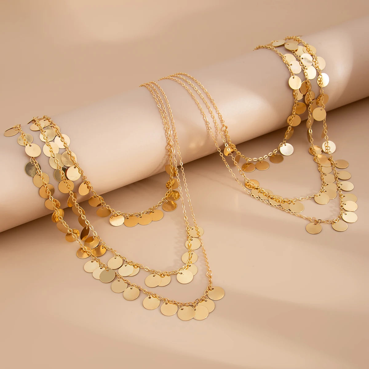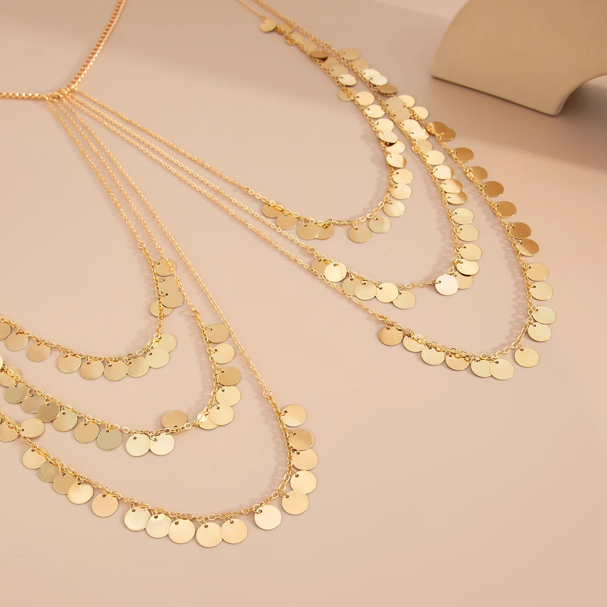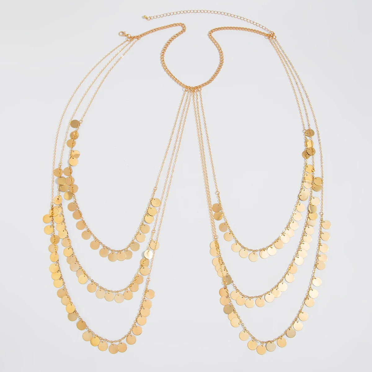 SOLAR DISC SHOULDER CHAIN: A bold yet fluid statement piece designed to drape effortlessly across the shoulders and collarbone. Featuring cascading gold-toned disc charms, this shoulder chain moves with the body, catching light from every angle. Lightweight and adjustable, it layers seamlessly over swimwear, dresses, or festival looks. Designed to elevate minimal outfits with a touch of sun-kissed glamour, this piece blends modern edge with effortless elegance. Perfect for summer styling, parties, and statement layering.
