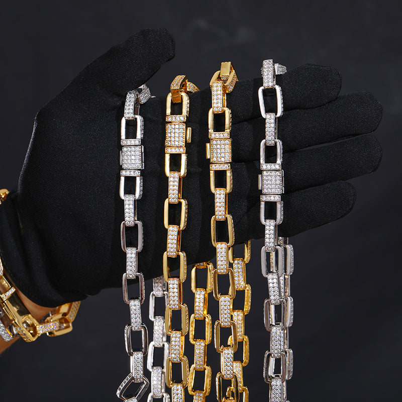 Experience luxury and versatility with our 11mm Moissanite Cuban Box Link Chain Necklace/Bracelet in Sterling Silver. Crafted for those who appreciate bold elegance, this piece exudes brilliance with its shimmering moissanite stones set in a sturdy sterling silver chain. Perfect as a statement necklace or a standout bracelet, it effortlessly elevates any look from casual to formal. Embrace timeless sophistication and impeccable craftsmanship with this essential addition to your jewelry collection. Ideal for those who seek enduring style and undeniable allure. 💎✨