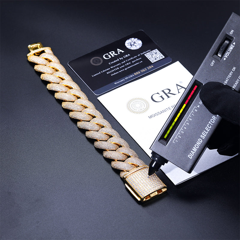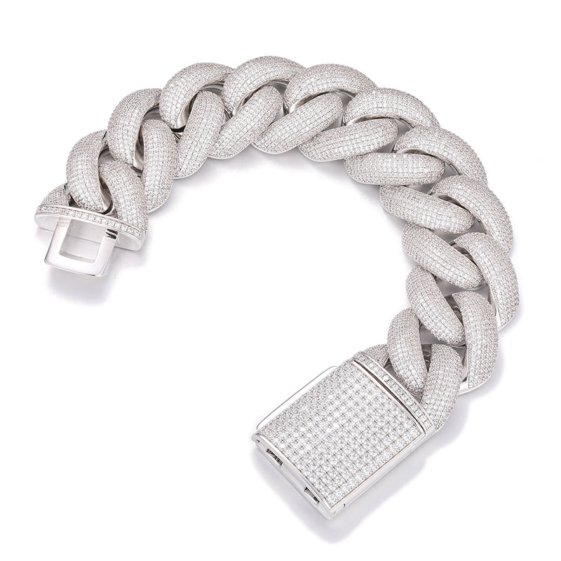 Presenting the Thickest 25mm Moissanite Diamond Cuban Link Bracelet in Sterling Silver, a luxurious blend of classic design and modern elegance. This stunning bracelet features meticulously set VVS Moissanite diamonds on premium 925 Sterling Silver, ensuring a radiant sparkle with every movement. The Cuban link design offers timeless appeal, making it a perfect accessory for any occasion. Whether you're dressing up for a special event or adding a touch of sophistication to your everyday look, this bracelet is the epitome of refined style and brilliance. Ideal for those who appreciate fine craftsmanship and exquisite jewelry.