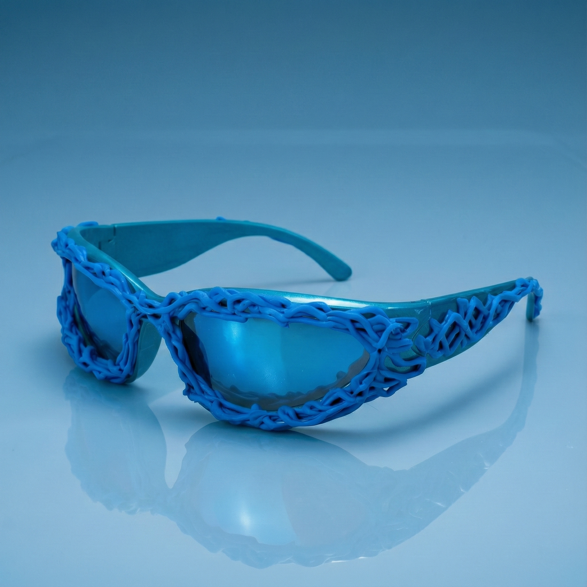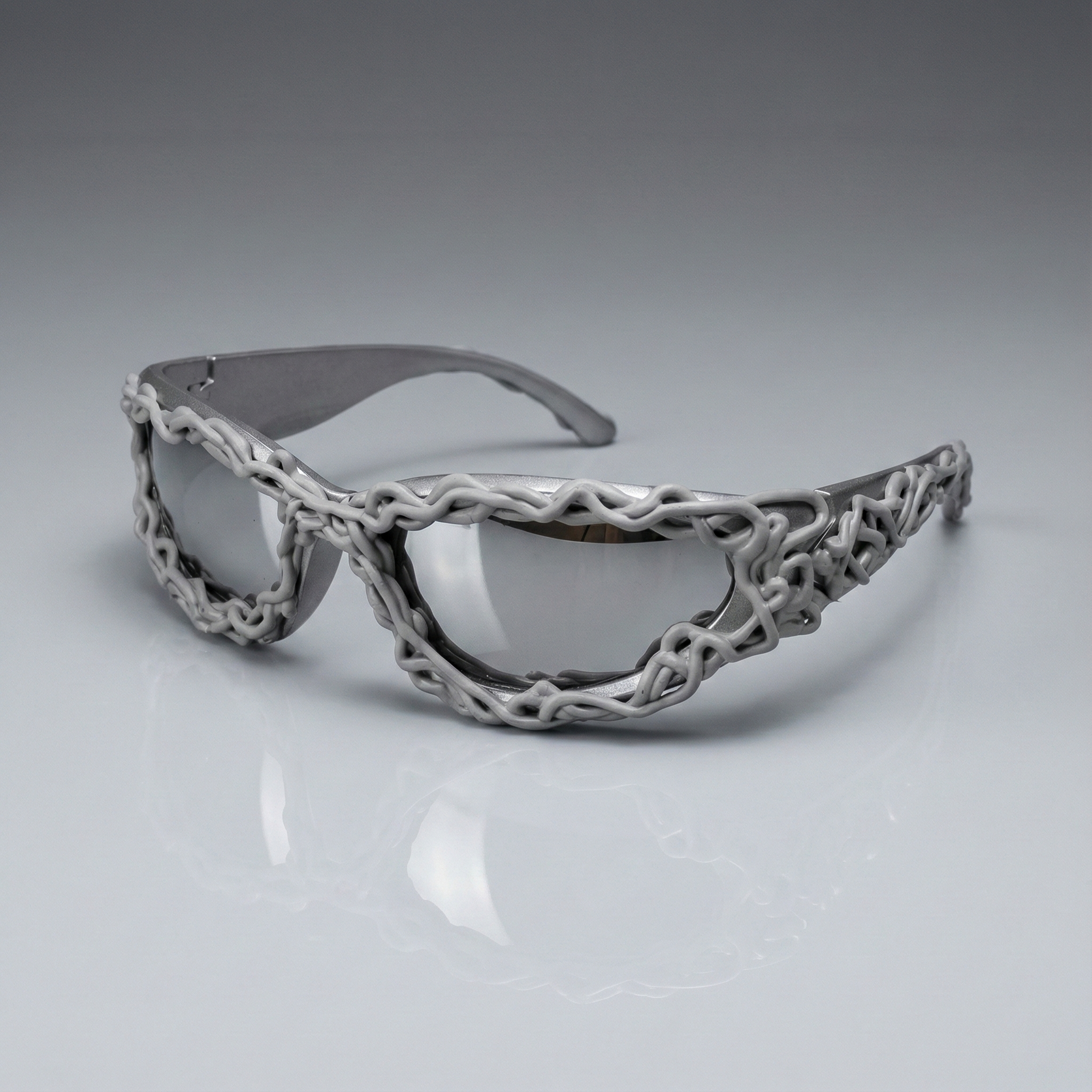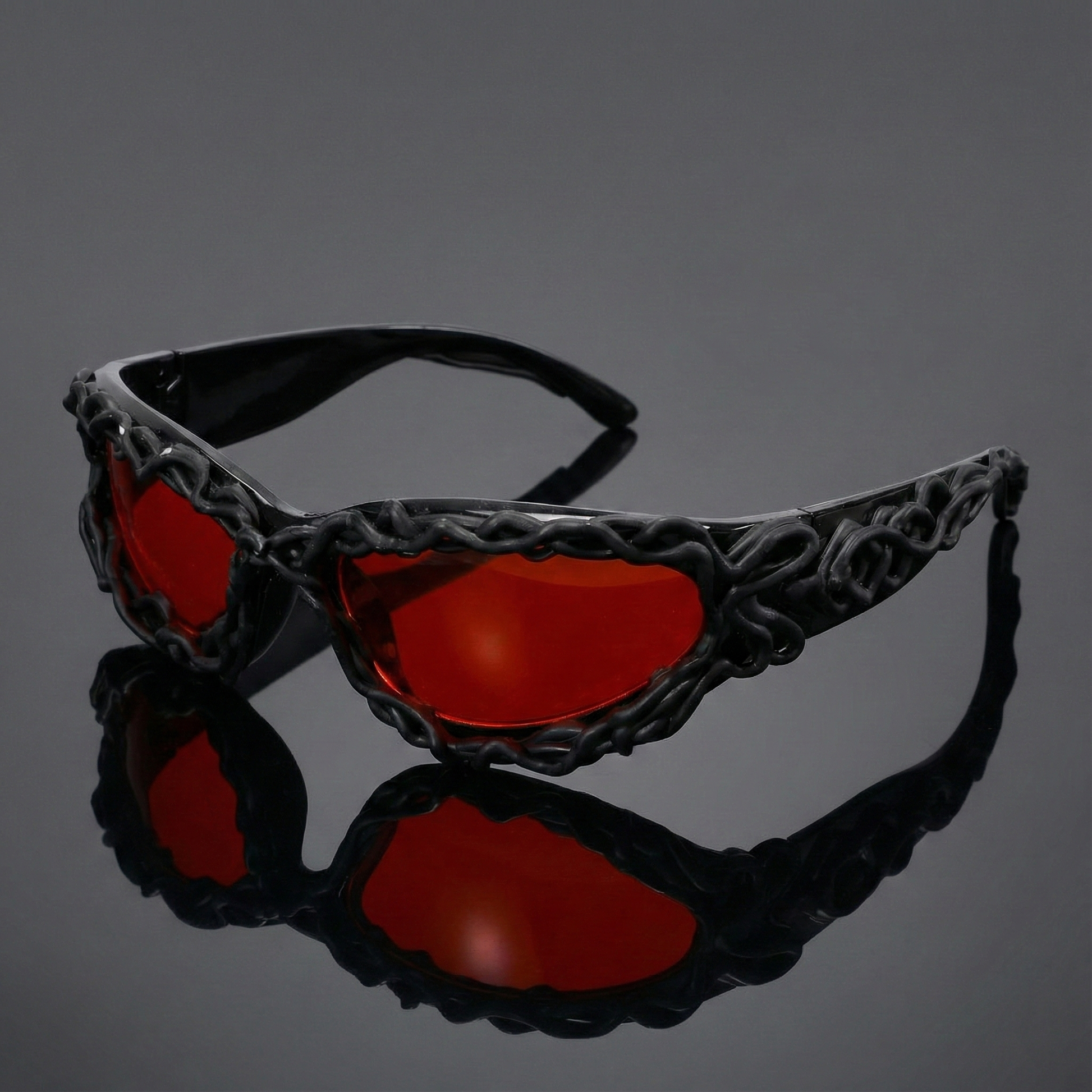 CHAINRIFT avant-garde sunglasses are a sculptural expression of distortion, structure, and rebellion. Defined by an interwoven chain-like frame that appears forged rather than manufactured, CHAINRIFT blurs the line between industrial design and wearable art. The fluid, organic contours wrap around bold lenses, creating a fractured silhouette that commands attention from every angle.