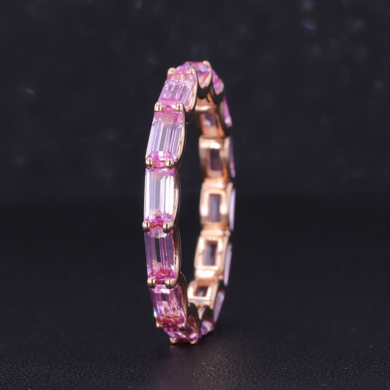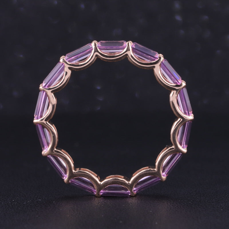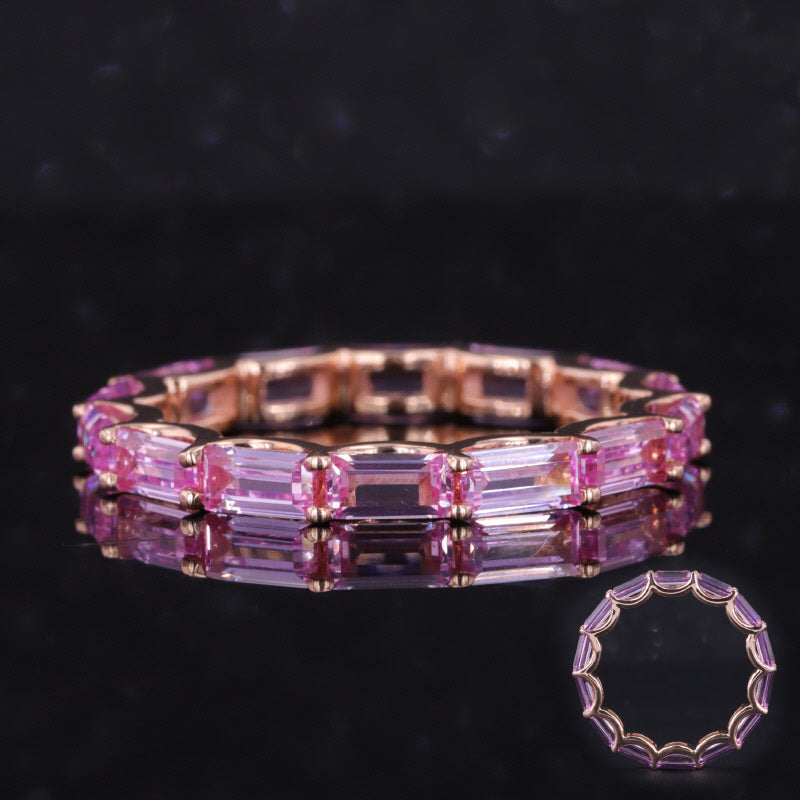 Adorn yourself with elegance wearing our Lab Grown Sakura Pink Sapphire Emerald Cut Ring in 14K Rose Gold. This exquisite ring showcases stunning 2.5x5mm lab grown sakura pink sapphire emerald cut gemstones, set in a luxurious 14K rose gold band.