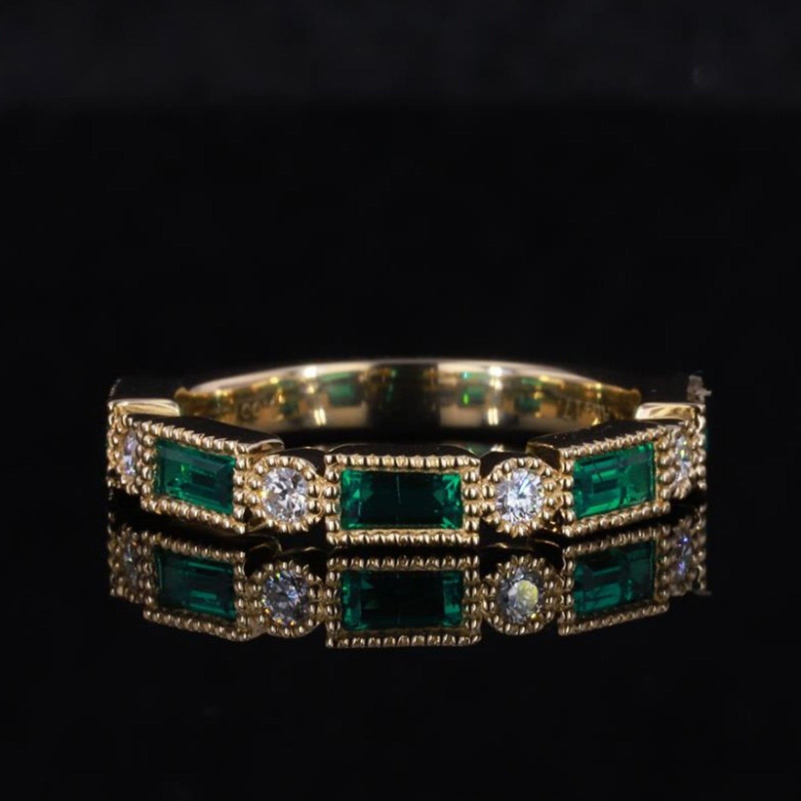 Elevate your style with our Lab Grown Emerald & Diamond Ring in 14K Gold. Featuring emerald-cut lab grown emeralds with interspersed round diamonds , these rings create a stunning and sophisticated look.