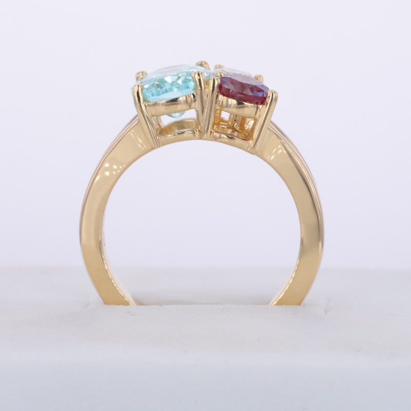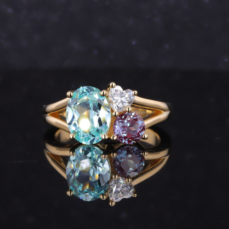 Elevate your style with our exquisite Three Stone Lab Grown Paraiba, Alexandrite Gemstones, and Moissanite Ring, beautifully crafted in 18K solid gold. This stunning ring features a captivating 7x9mm oval-cut Paraiba gemstone, accompanied by a sparkling moissanite diamond and Alexandrite Gemstones.
