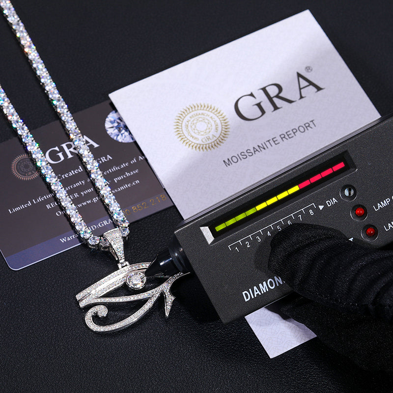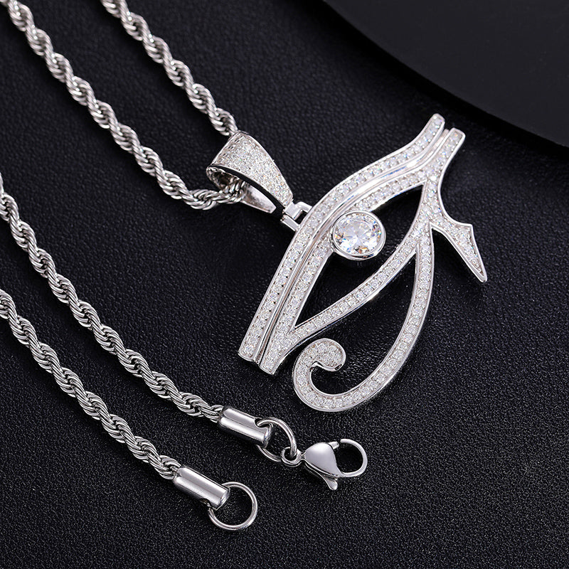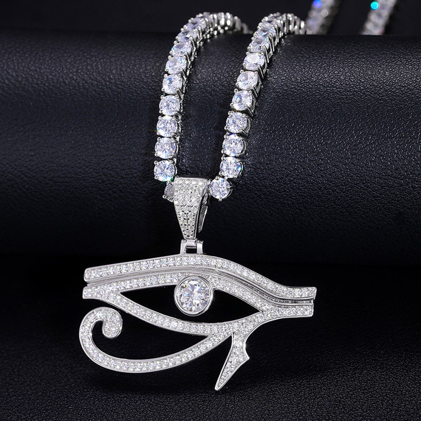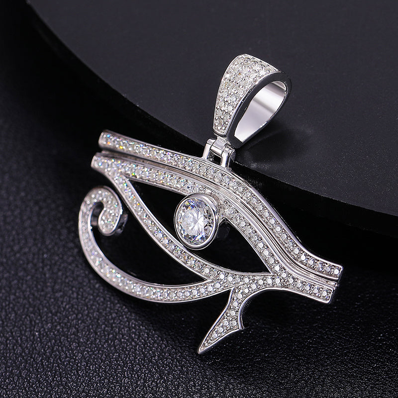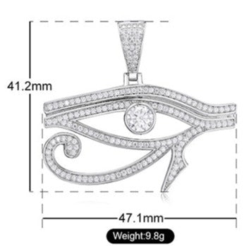 Illuminate your style with our captivating Moissanite Diamond Iced Out Egyptian Eye of Horus Pendant in Sterling Silver. 👁✨ Crafted with meticulous attention to detail, this pendant features intricate design elements and dazzling Moissanite diamonds, creating a mesmerizing aura of elegance and protection. Perfect for adding a touch of mystique and sophistication to any ensemble, it's a must-have accessory for the modern trendsetter. Elevate your look with the enchanting allure of our Evil Eye Pendant.