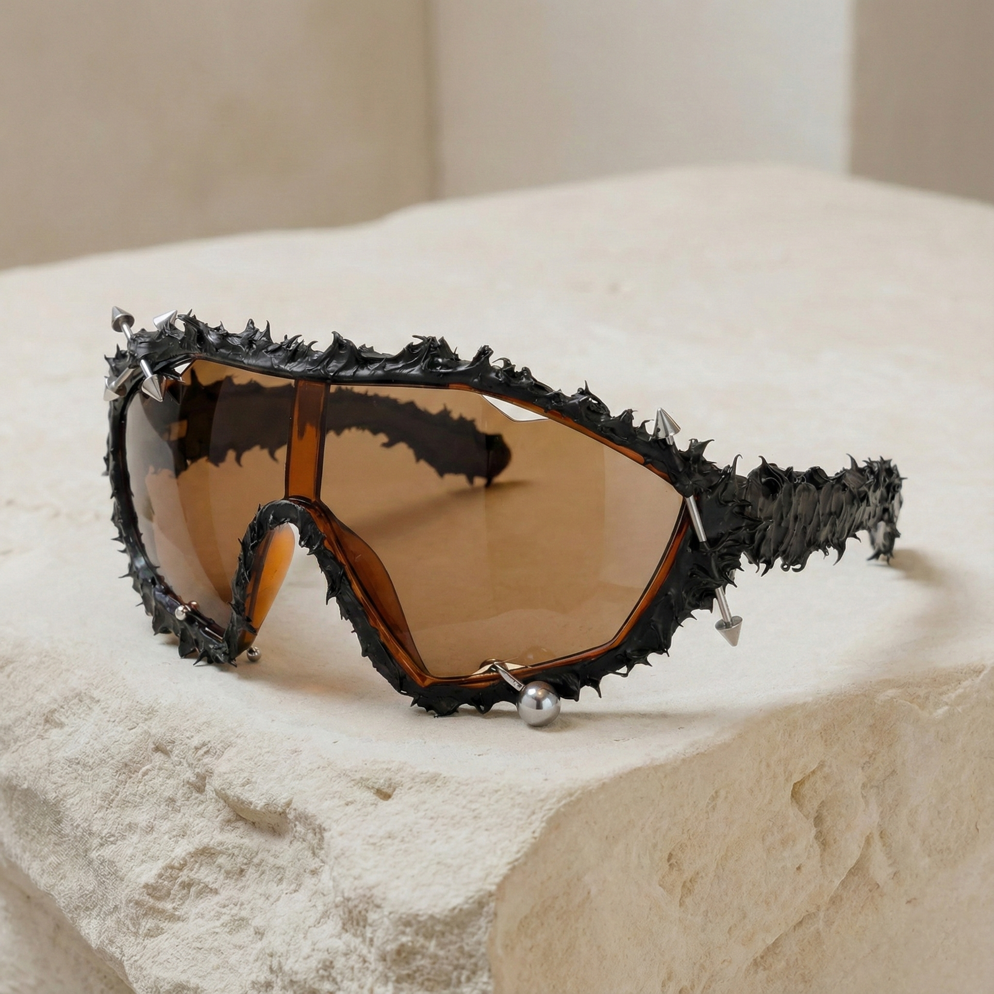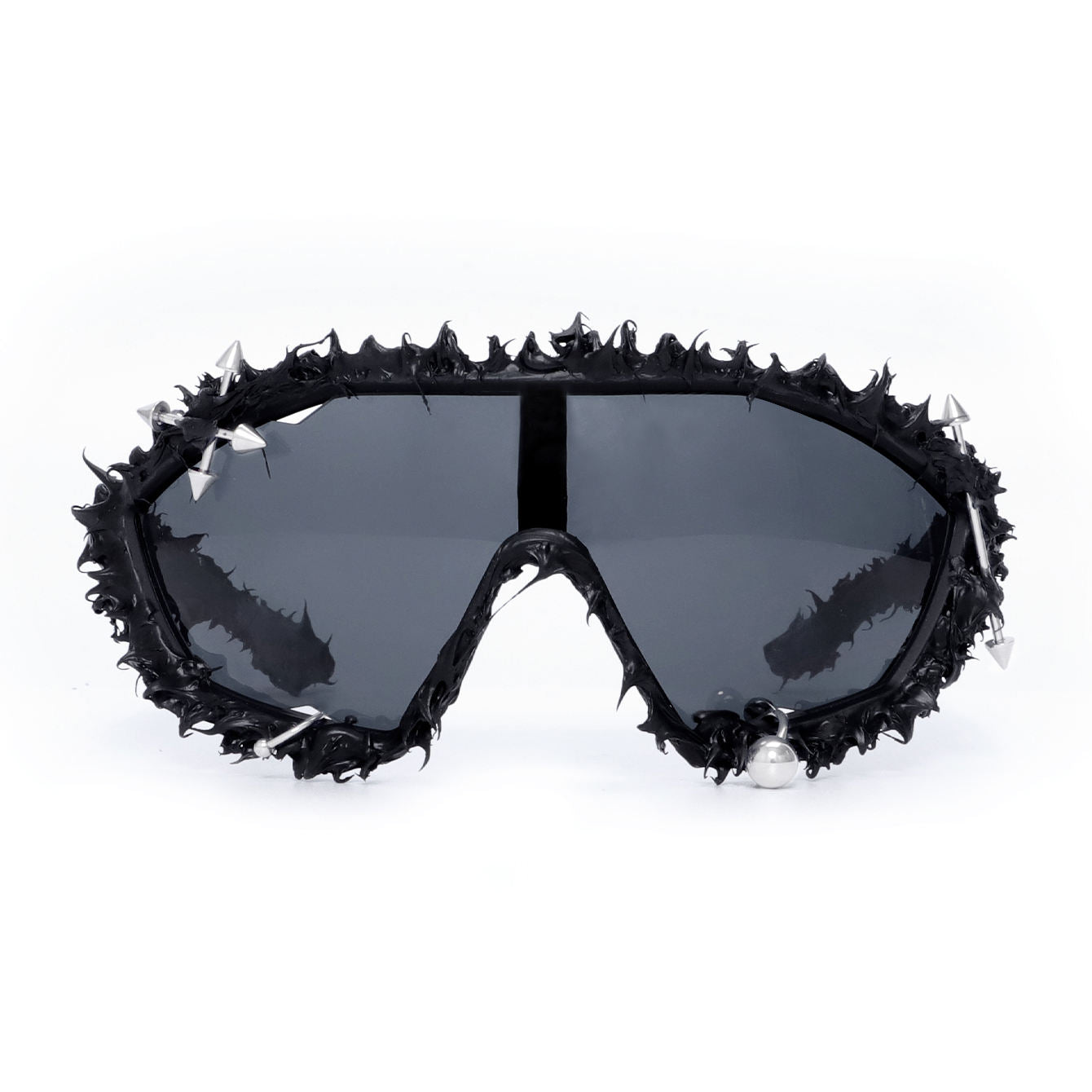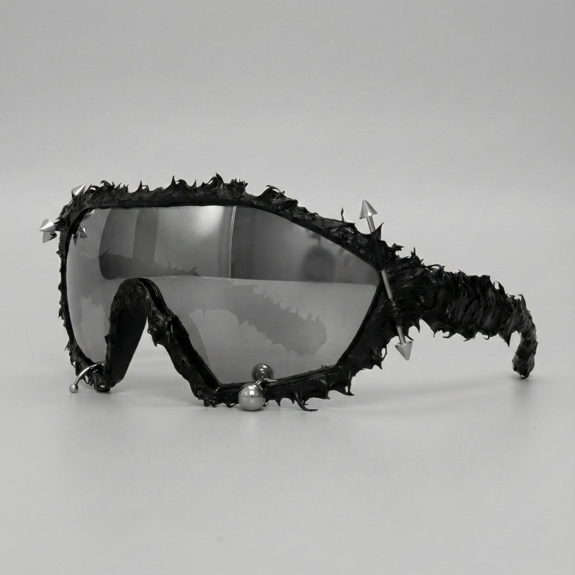 Obsidian Spike Visor: is a statement piece designed at the intersection of avant-garde fashion and industrial rebellion. Featuring a full shield visor wrapped in a raw, textured black frame, this design commands attention with its aggressive silhouette and sculptural presence. Metallic spike and stud details punctuate the frame, creating a bold contrast between matte darkness and sharp reflective accents.
