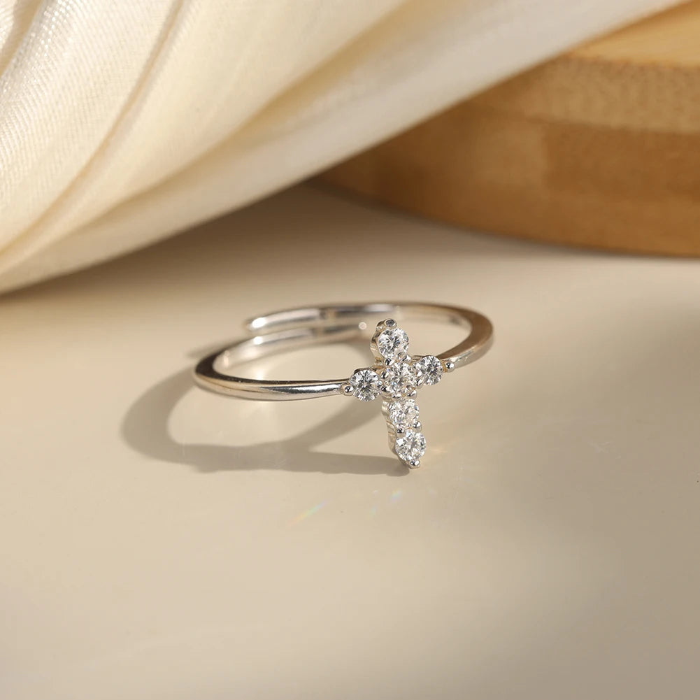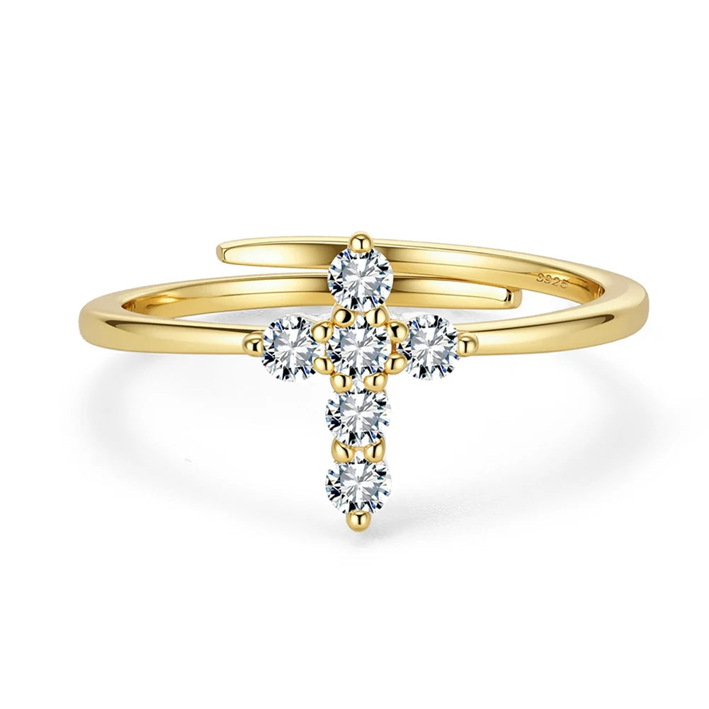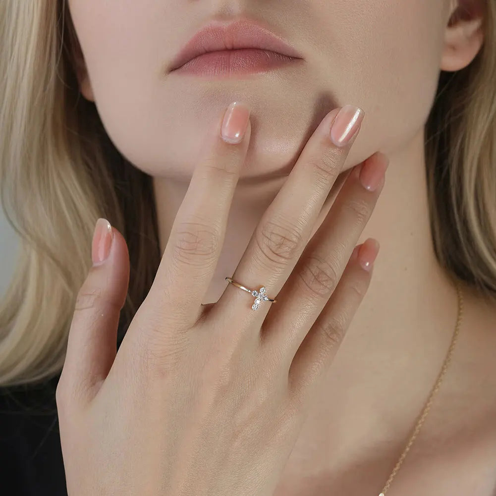 Round Moissanite Cross Ring in Sterling Silver: This ring features a clean cross design set with round moissanite stones that deliver subtle, diamond-like brilliance. Crafted in high-quality sterling silver, it offers a balanced mix of symbolism and everyday elegance. Designed for comfortable daily wear, this piece works effortlessly on its own or layered, making it a meaningful addition to any jewelry collection.