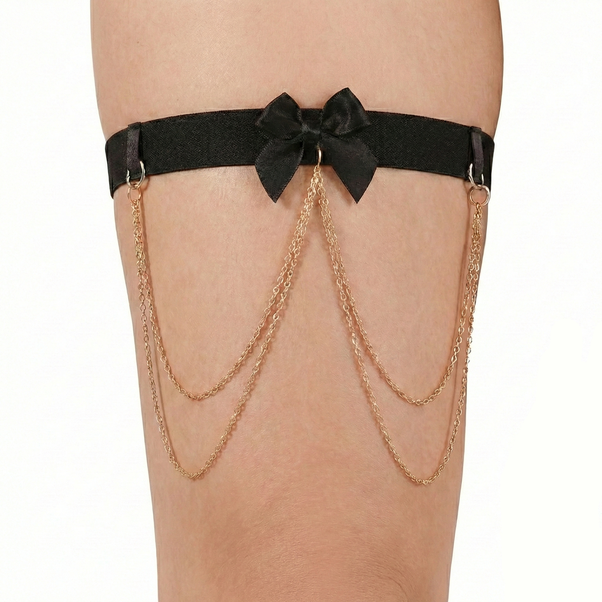VELA DRAPED THIGH GARTER CHAIN: Designed to highlight movement and confidence, this draped thigh garter chain features delicate cascading chains anchored by a sleek elastic band with a satin bow accent. The fluid silhouette wraps effortlessly around the thigh, creating a bold yet elegant statement with every step. Perfect for styling with mini dresses, skirts, or lingerie-inspired looks, it adds a touch of sensual glamour without overpowering your outfit. Lightweight, adjustable, and made to shine. ✨🖤