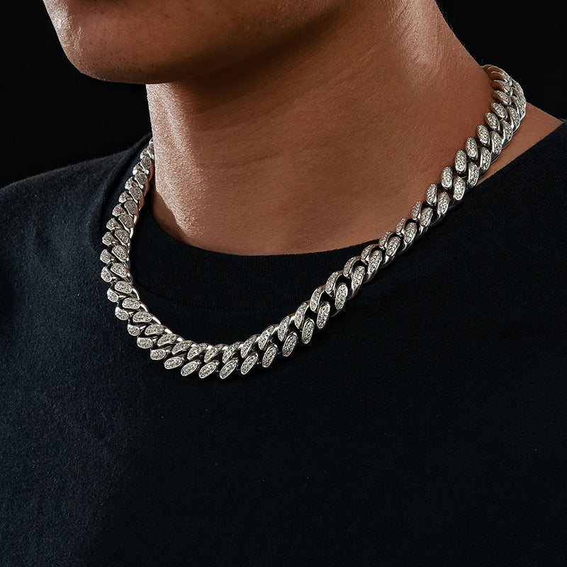 12MM TWO-ROW MOISSANITE BEZEL CUBAN LINK CHAIN IN STERLING SILVER: Crafted in premium sterling silver, this 12mm Cuban link chain features a refined two-row bezel setting that securely frames high-sparkle moissanite stones for a clean, polished finish. The bezel-set design adds depth and durability while delivering a smooth, uninterrupted shine across each link. Finished with a secure clasp for confident everyday wear, it’s designed to stand out, worn solo or layered. Sleek, structured, and effortlessly luxe ✨🧊