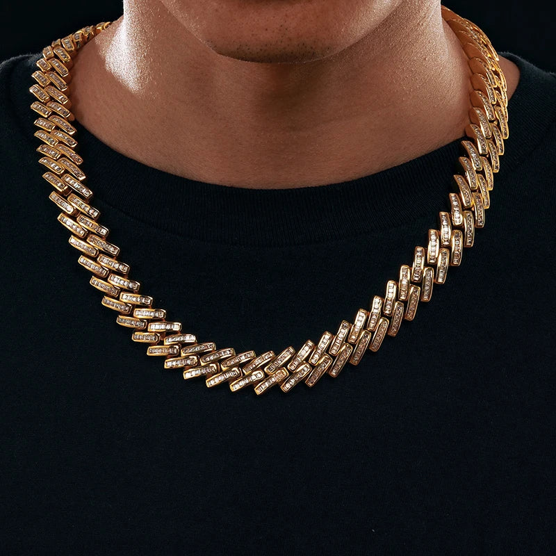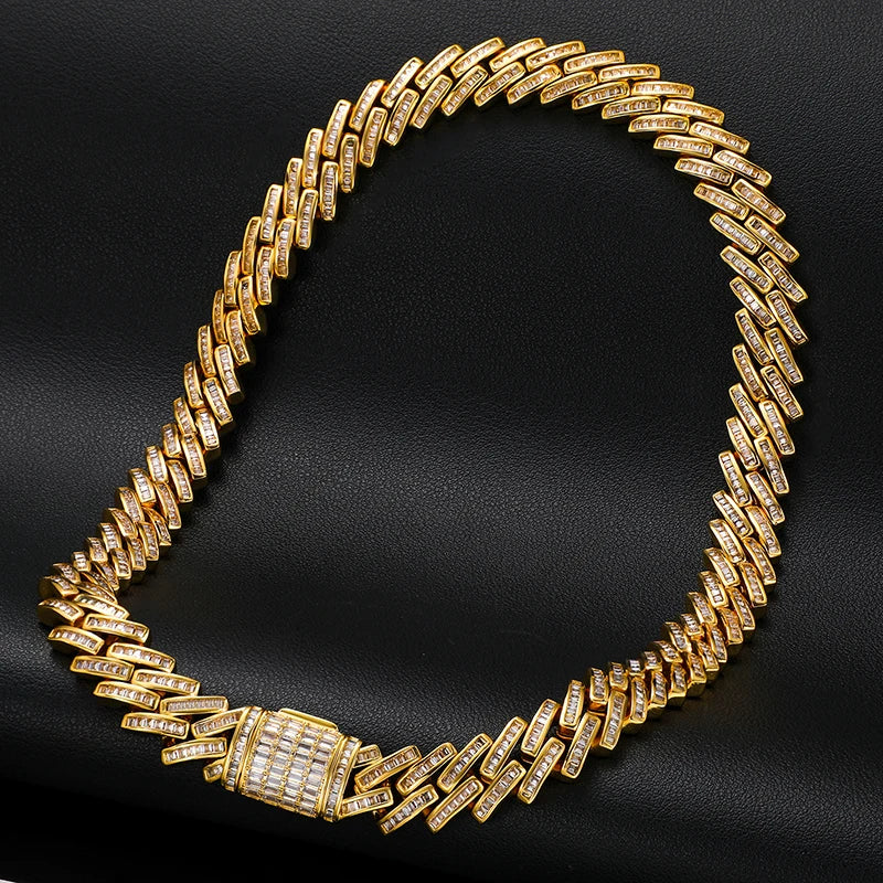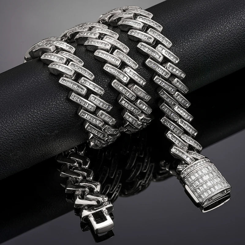 14MM MOISSANITE BAGUETTE CUBAN LINK NECKLACE/BRACELET IN STERLING SILVER: Crafted in premium sterling silver, this 14mm Cuban link necklace features precision channel-set baguette moissanite stones that deliver a sharp, high-impact shine. The structured baguette setting adds clean geometry to the classic Cuban silhouette, creating a bold yet refined look. Finished with a secure box clasp for confident wear, it’s designed to stand out when worn solo or layered. Powerful, polished, and unmistakably luxe ✨🧊