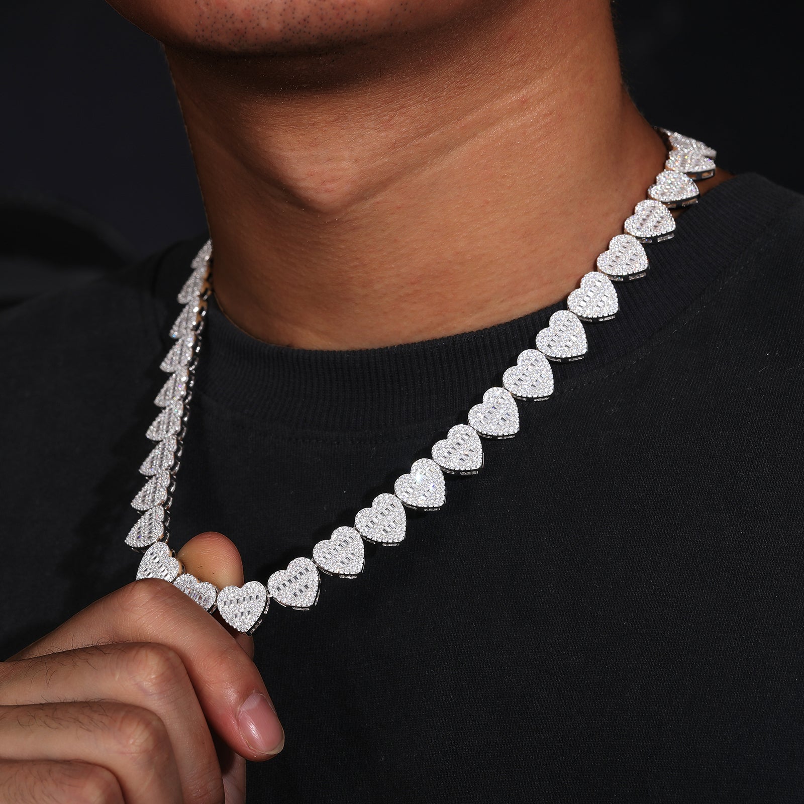 Introducing the 15mm Baguette Moissanite Heart Tennis Link Chain Necklace/Bracelet in Sterling Silver. This exquisite piece features a stunning design with 15mm baguette-cut moissanite stones intricately set in a heart-shaped tennis link chain. Crafted in polished sterling silver, it exudes elegance and charm, perfect for adding a touch of sparkle to any ensemble. Versatile and stylish, it can be worn as a necklace or bracelet, making it an ideal choice for both formal occasions and everyday wear. 💎✨