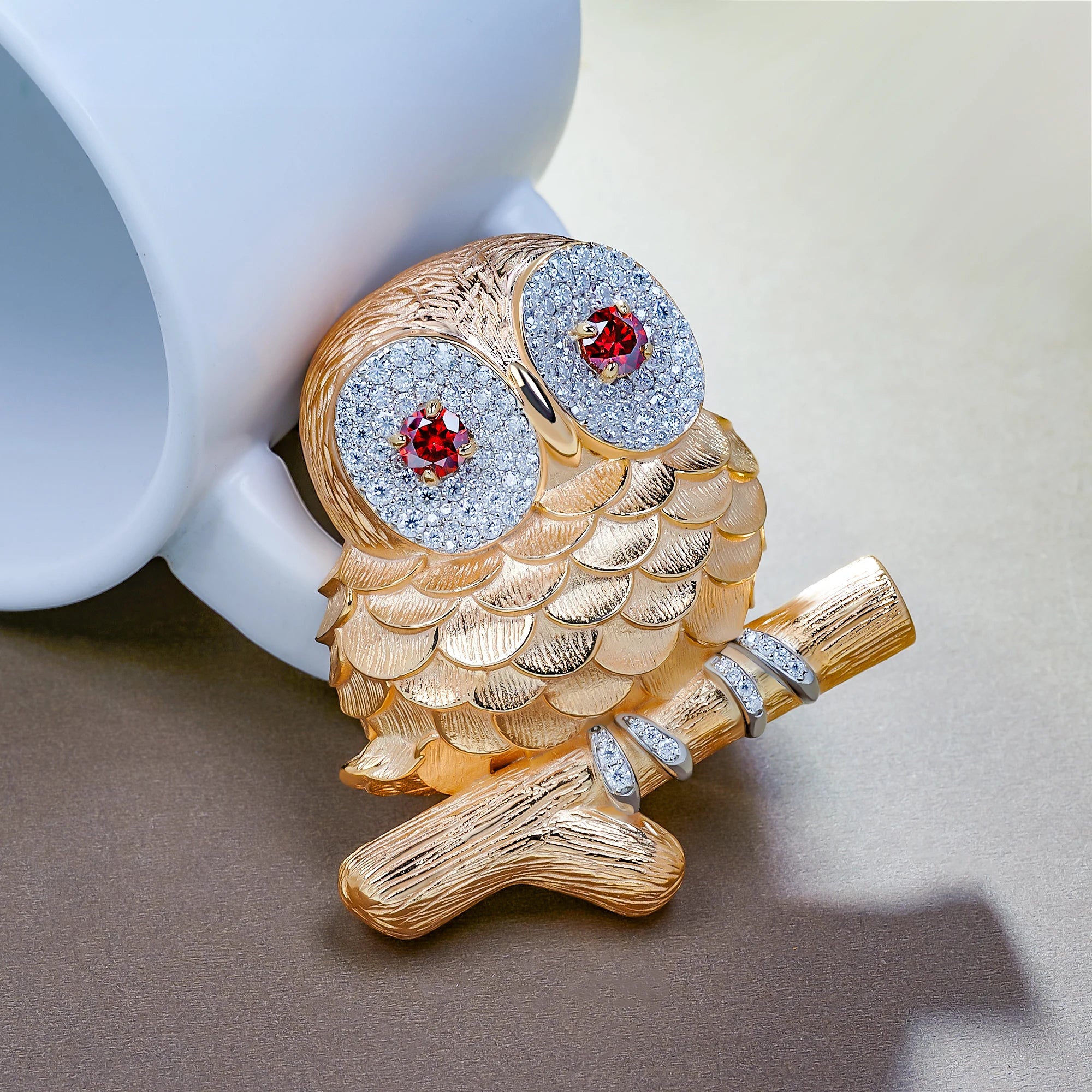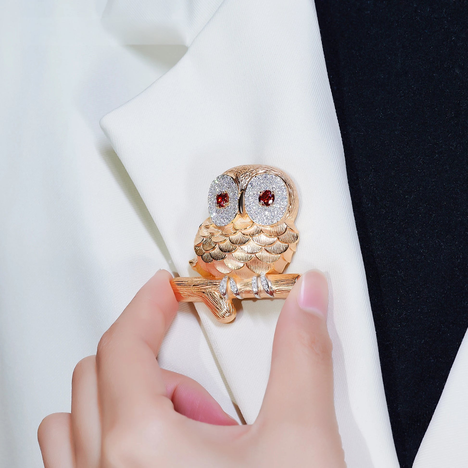 18K Gold Plated Moissanite Crimson Gaze Owl Brooch in Sterling Silver: A stunning emblem of wisdom and elegance 🦉✨. Expertly crafted in sterling silver with radiant 18K gold plating, this brooch features brilliant moissanite detailing and striking crimson gemstone eyes. Symbolizing intuition and grace, it’s a captivating statement piece that adds a touch of sophistication to any look.