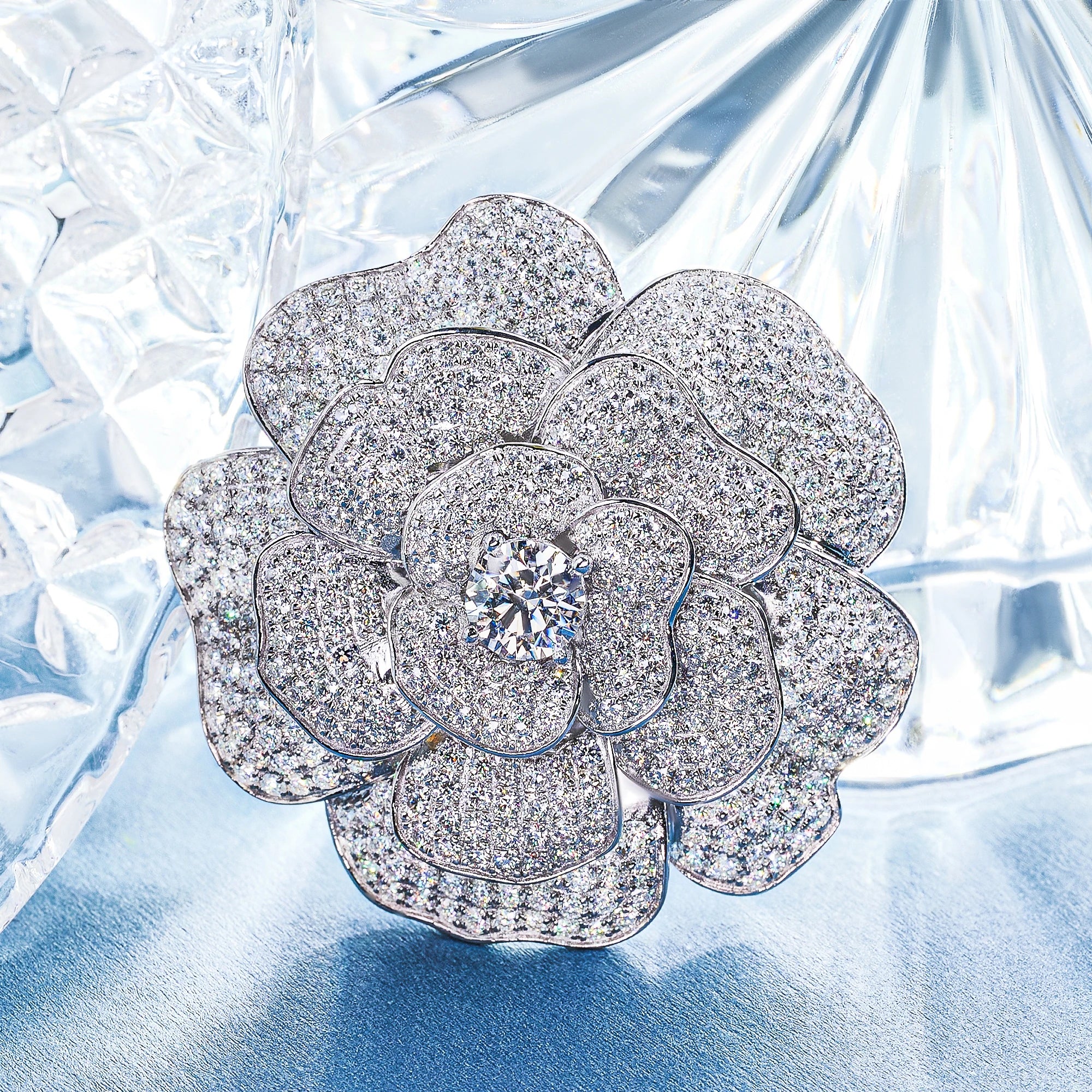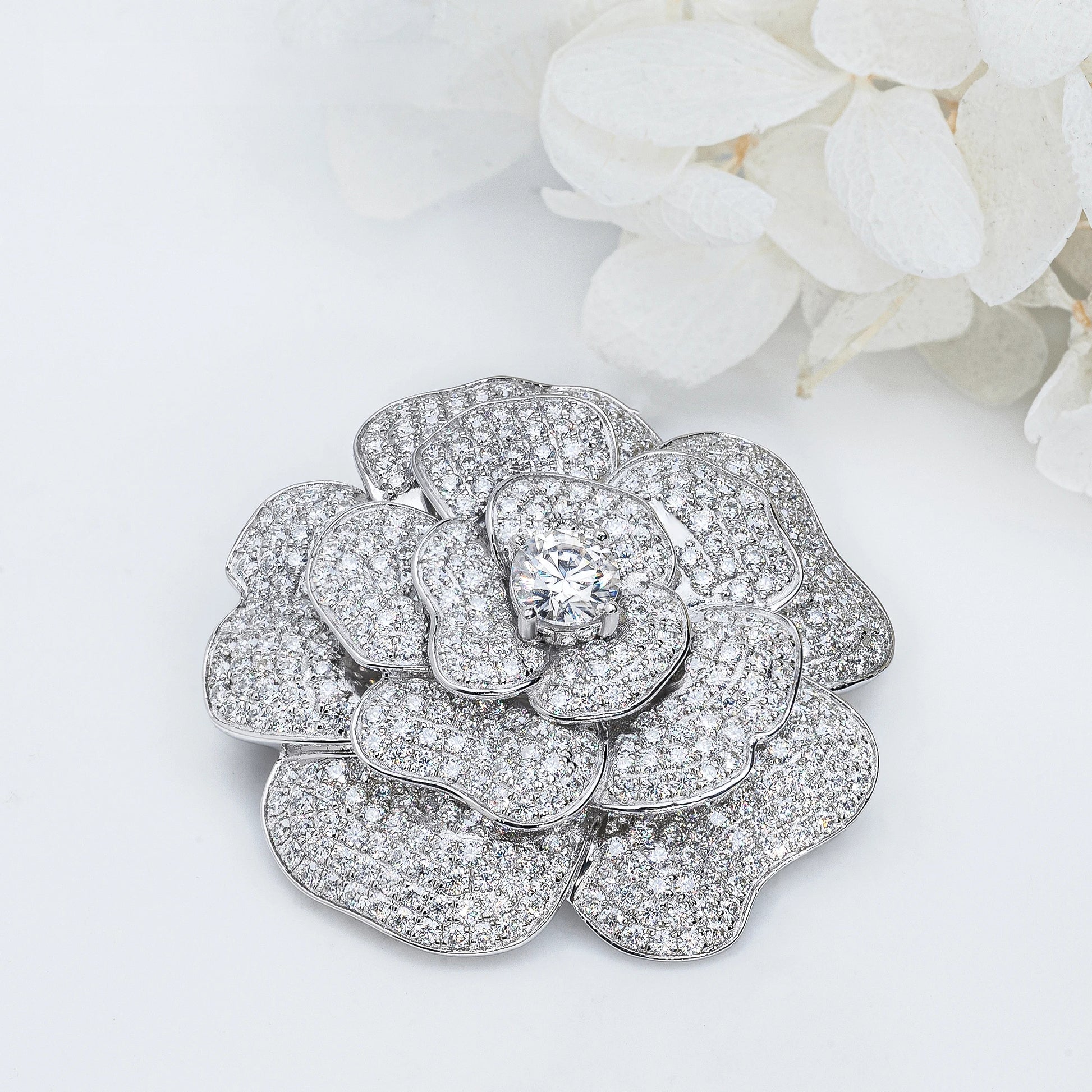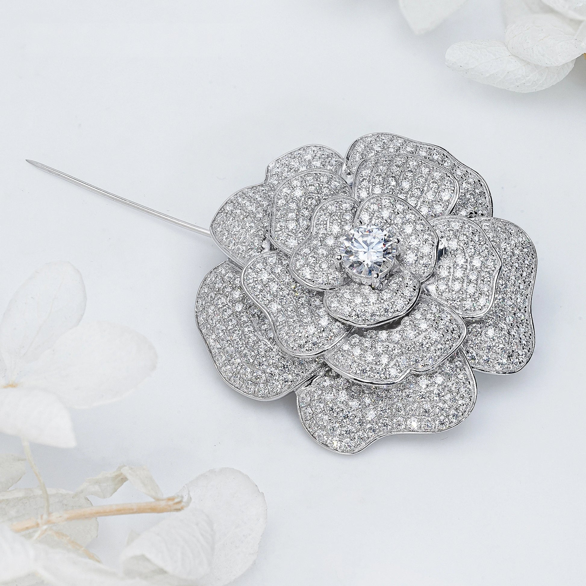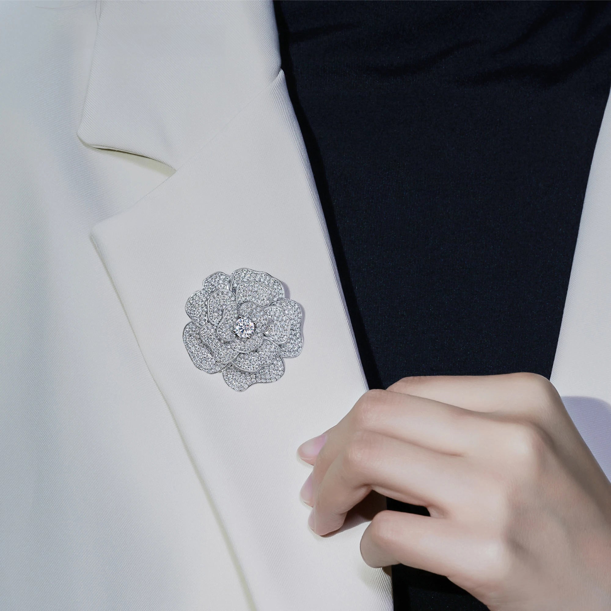 18K White Gold Plated Moissanite Eternal Bloom Flower Brooch in Sterling Silver: A timeless symbol of grace and radiance 🌸✨. Crafted in premium sterling silver with elegant 18K white gold plating, this brooch showcases layered petals encrusted with dazzling moissanite stones. Exuding luxury and refinement, it captures the beauty of an everlasting bloom — perfect for elevating any ensemble with classic elegance.