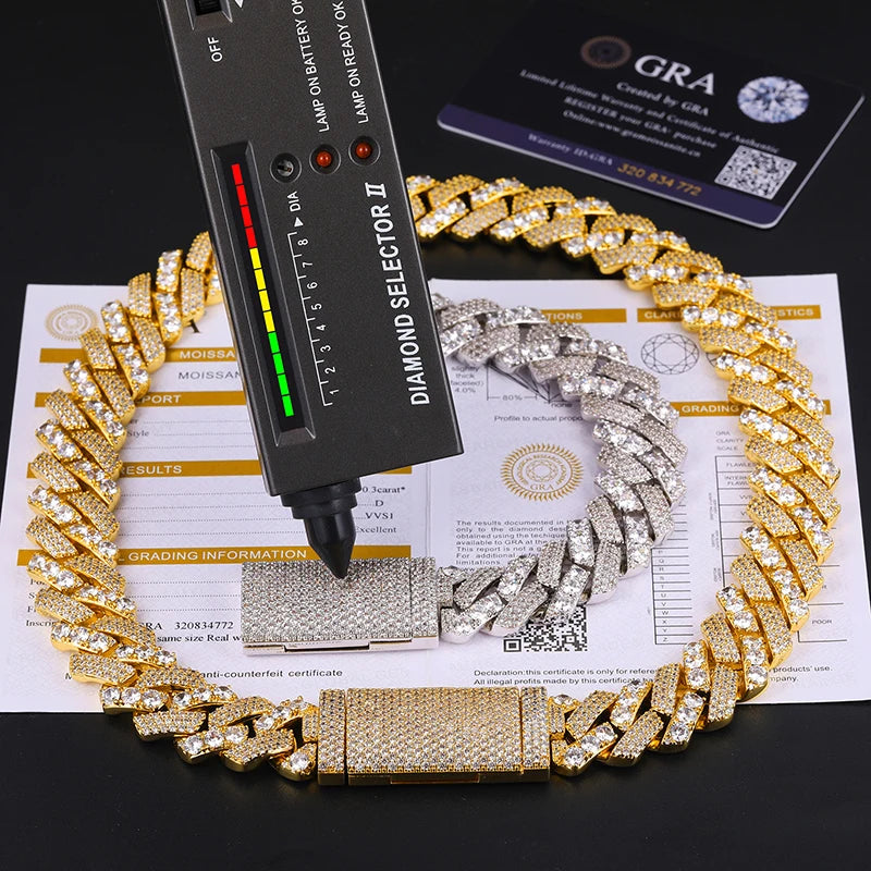 18MM MOISSANITE DUAL-SET CUBAN LINK BRACELET/NECKLACE IN STERLING SILVER: Crafted in premium sterling silver, this 18mm Cuban link piece features a distinctive dual-set design that combines different moissanite settings within each link for added depth and texture. The contrast between pavé and accent-set stones creates a dynamic, high-impact shine while maintaining a bold, structured silhouette. Finished with a secure box clasp for confident wear, it’s designed to stand out when worn solo or layered. Powerful, detailed, and unapologetically luxe ✨🧊