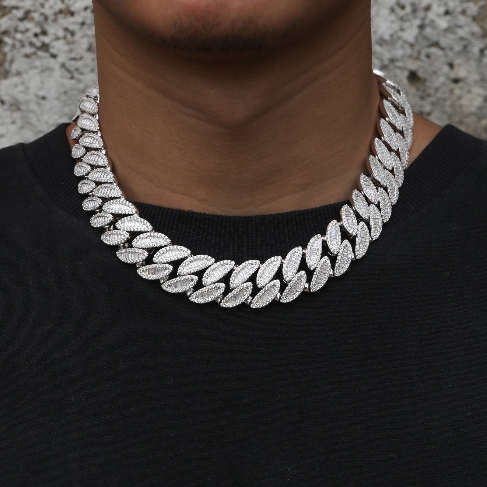 20MM BAGUETTE MOISSANITE LEAF CUBAN LINK CHAIN NECKLACE/BRACELET IN STERLING SILVER