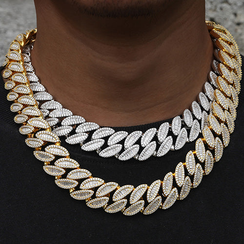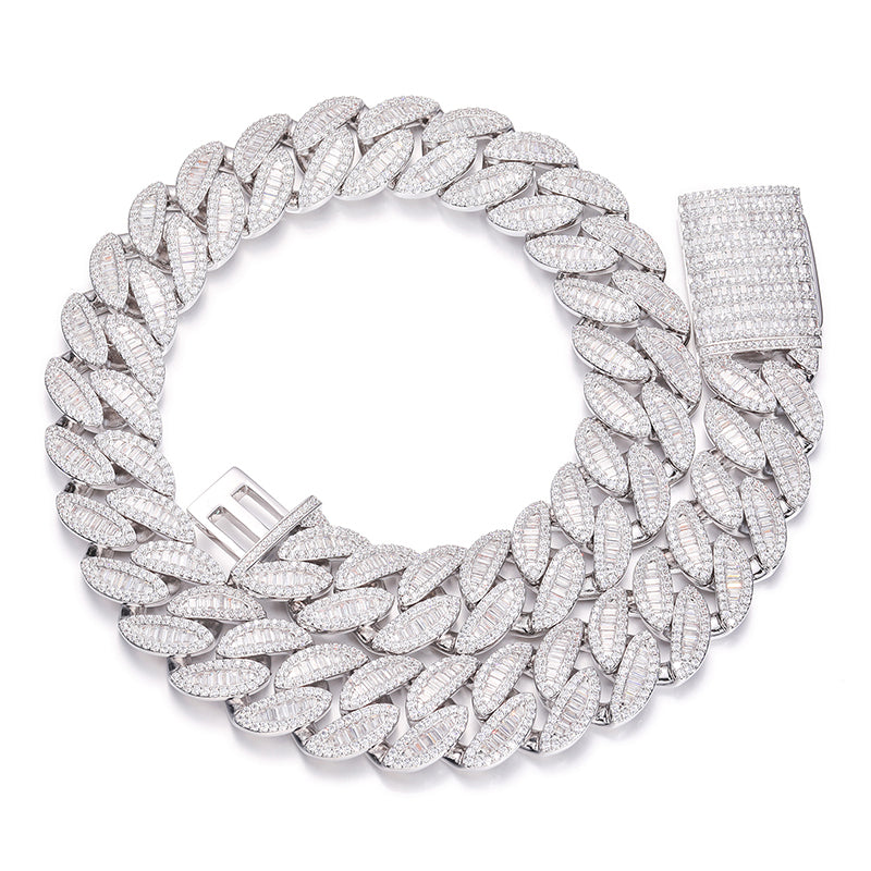 The 20MM Baguette Moissanite Leaf Cuban Link Chain Necklace/Bracelet in sterling silver features intricate leaf designs adorned with dazzling baguette moissanite stones. This versatile piece can be worn as a necklace or bracelet, adding a unique blend of elegance and sophistication to any outfit. Perfect for special occasions or everyday wear. 💎✨