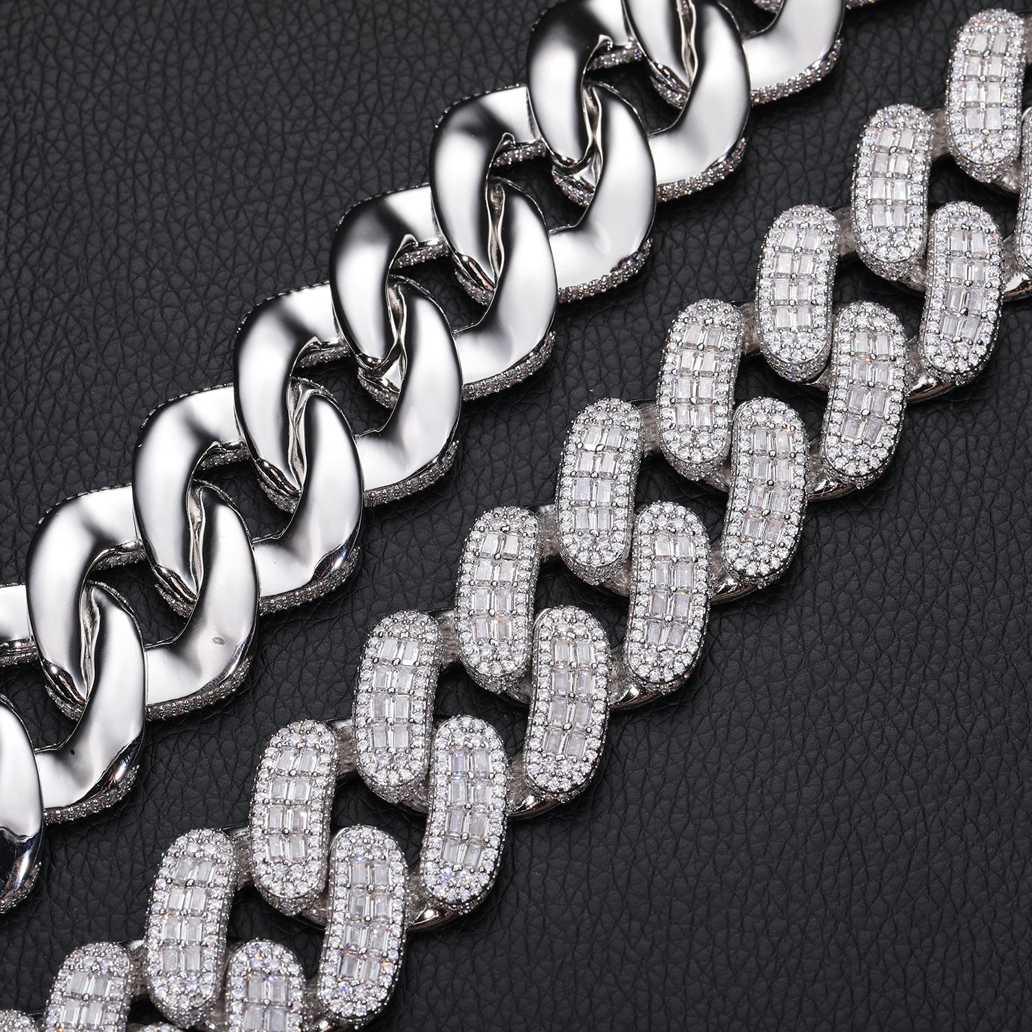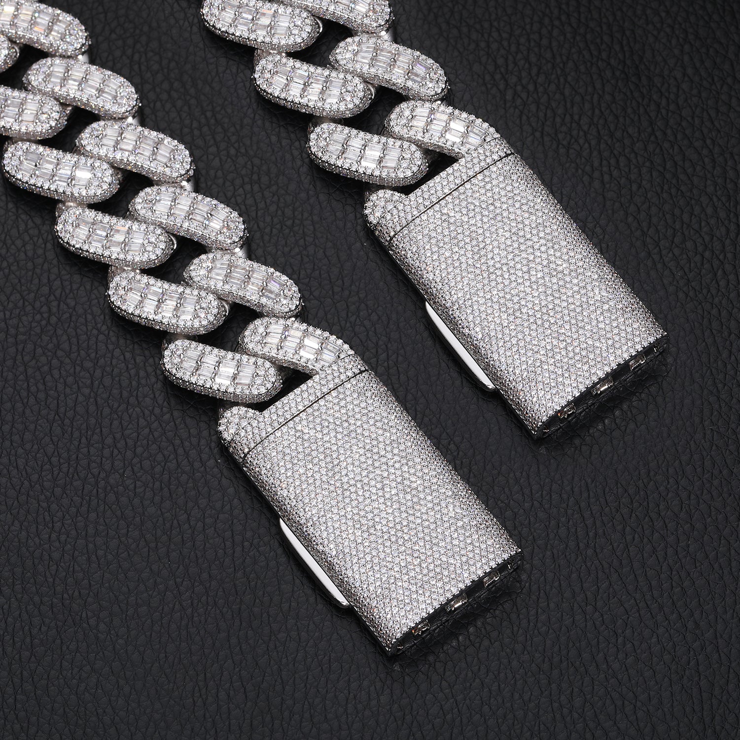 Indulge in luxury with our 28mm Baguette Moissanite Diamond Cuban Link Chain in Sterling Silver. Crafted with precision and elegance, this necklace features dazzling baguette-cut moissanite diamonds set along each link, radiating opulence and sophistication. Made from high-quality sterling silver, it offers durability and shine that lasts. Elevate any ensemble with this statement piece, perfect for those who appreciate refined style and timeless beauty.