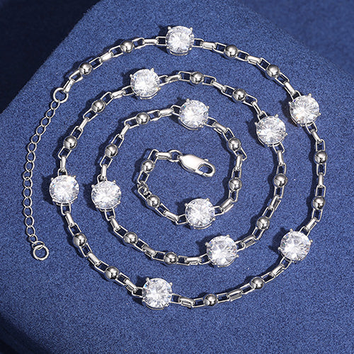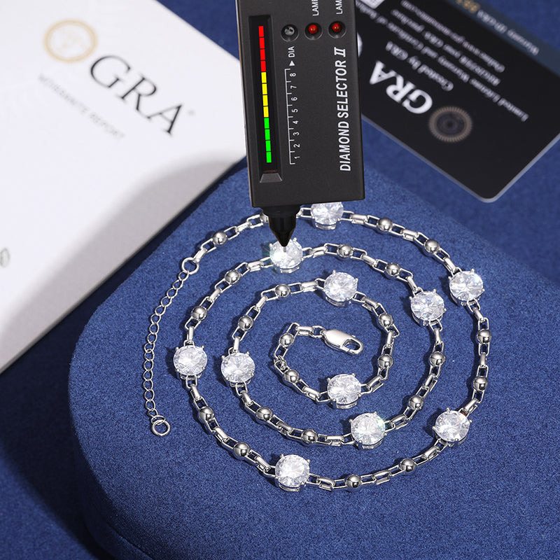 Introducing our 8mm Moissanite Bead Link Chain Necklace/Bracelet in Sterling Silver. This necklace features a stylish bead link design, adorned with round brilliant-cut moissanite stones. Crafted with precision in high-quality sterling silver, it offers a blend of elegance and sparkle, perfect for enhancing any outfit with a touch of sophistication. Ideal for both casual wear and special occasions, this necklace is designed to shine and captivate. Elevate your jewelry collection with this exquisite piece, crafted to dazzle and inspire. 💎✨