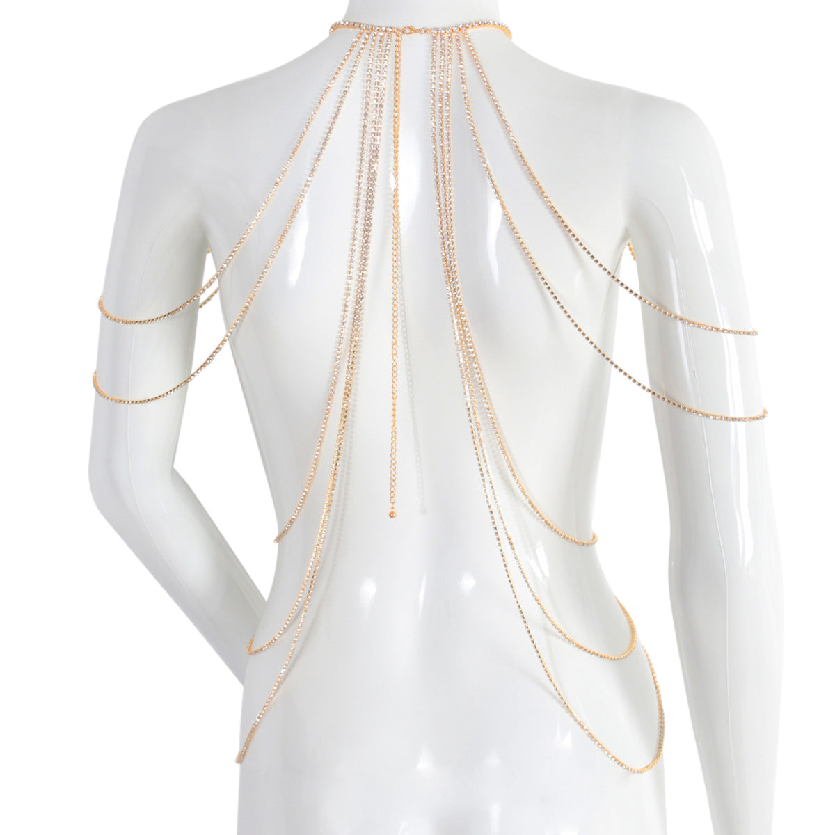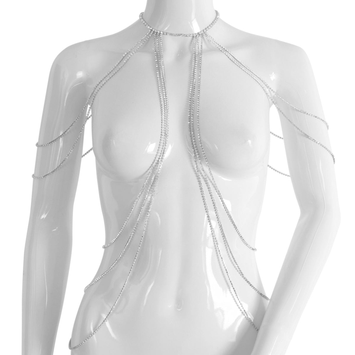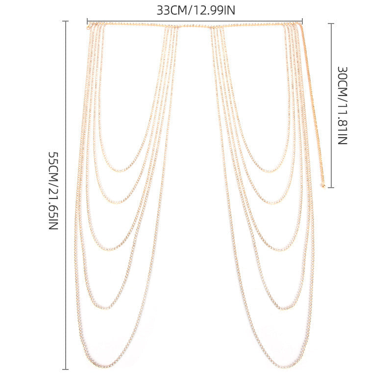 AURORA FALL BODY CHAIN: A radiant cascade designed to move like light across the body. This statement body chain features shimmering strands that flow from the neckline and shoulders, draping effortlessly over the torso for a fluid, sculpted silhouette. Delicate yet striking, it catches every movement with a soft, luminous sparkle. Perfect for evening wear, festivals, or layered over minimal outfits, this piece transforms any look into an unforgettable moment of modern elegance ✨