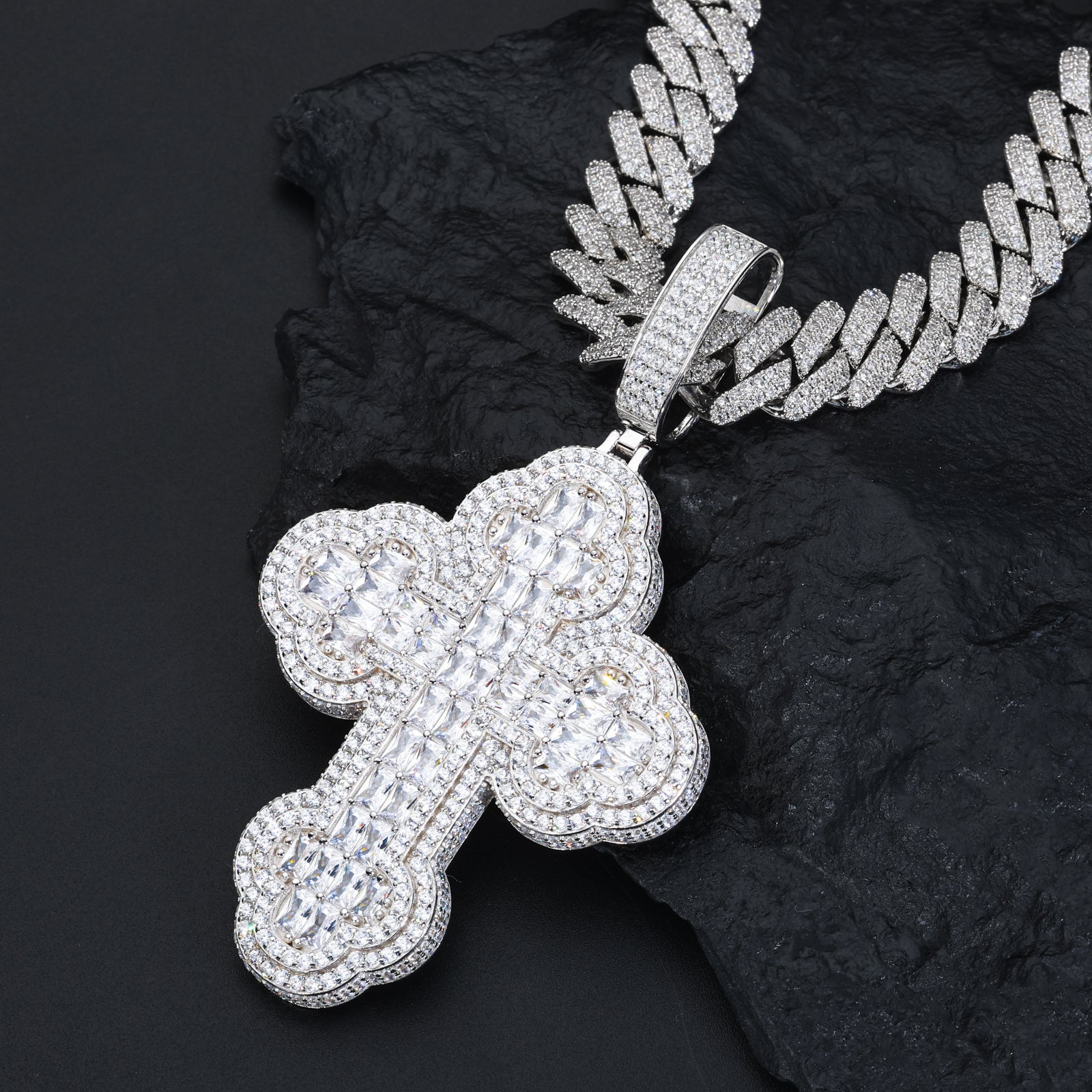 Baguette Cut Moissanite Iced Out Cross Pendant in Sterling Silver combines timeless symbolism with modern luxury. This exquisite cross features baguette-cut moissanite arranged in a captivating design, radiating brilliance from every angle. Set in premium sterling silver, it offers durability and a polished finish that elevates any ensemble. Perfect for those who value faith and style, this pendant celebrates sustainable elegance with a bold touch. 🌟✨