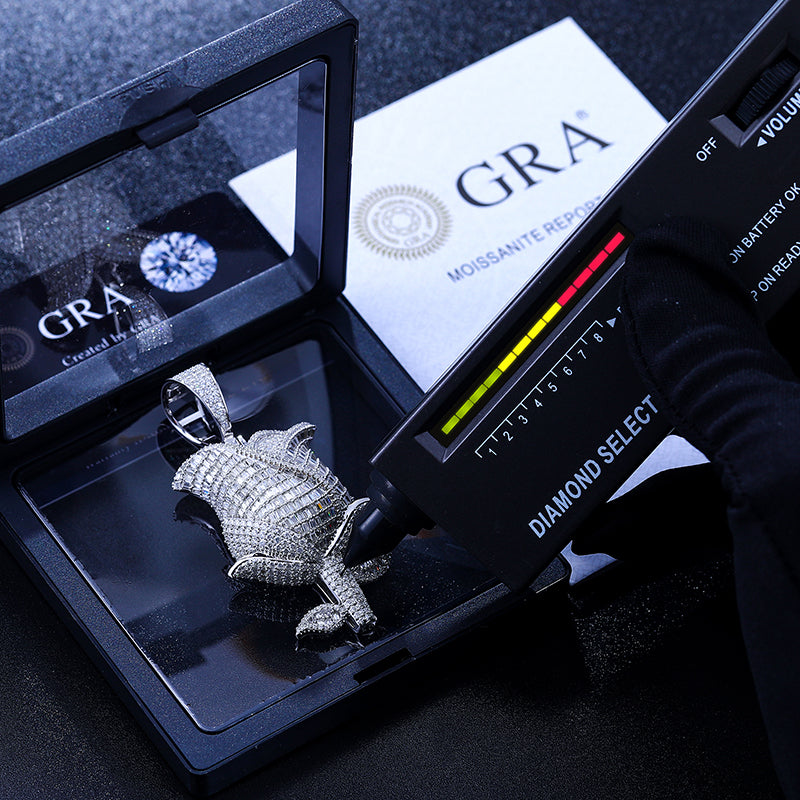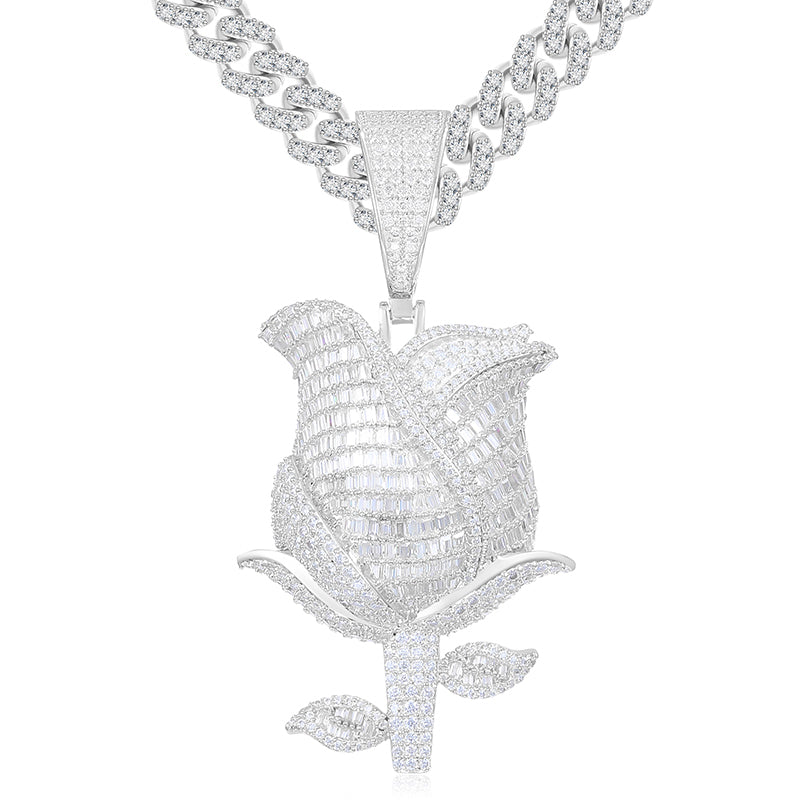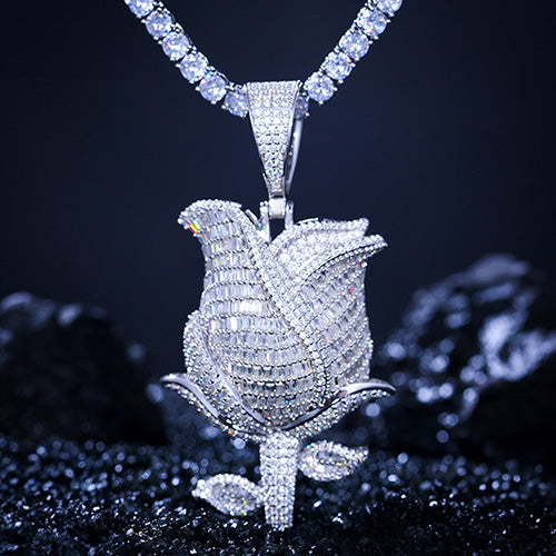 BAGUETTE MOISSANITE ROSE FLOWER PENDANT IN STERLING SILVER
