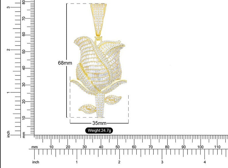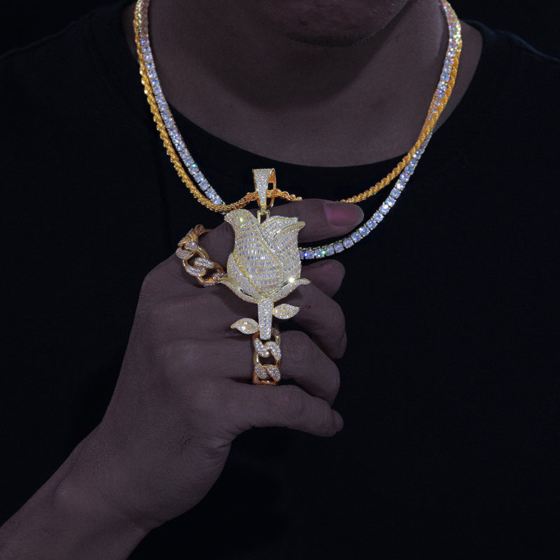 Introducing our Baguette Moissanite Rose Flower Pendant in Sterling Silver. This stunning pendant features a delicate rose flower design, adorned with sparkling baguette-cut moissanite stones set in high-quality sterling silver. With its intricate craftsmanship and brilliant sparkle, this pendant is perfect for adding a touch of floral elegance to any outfit. Ideal for both everyday wear and special occasions, it beautifully combines timeless charm with modern sophistication. Elevate your jewelry collection with this exquisite piece that exudes grace and beauty. 💎🌹✨
