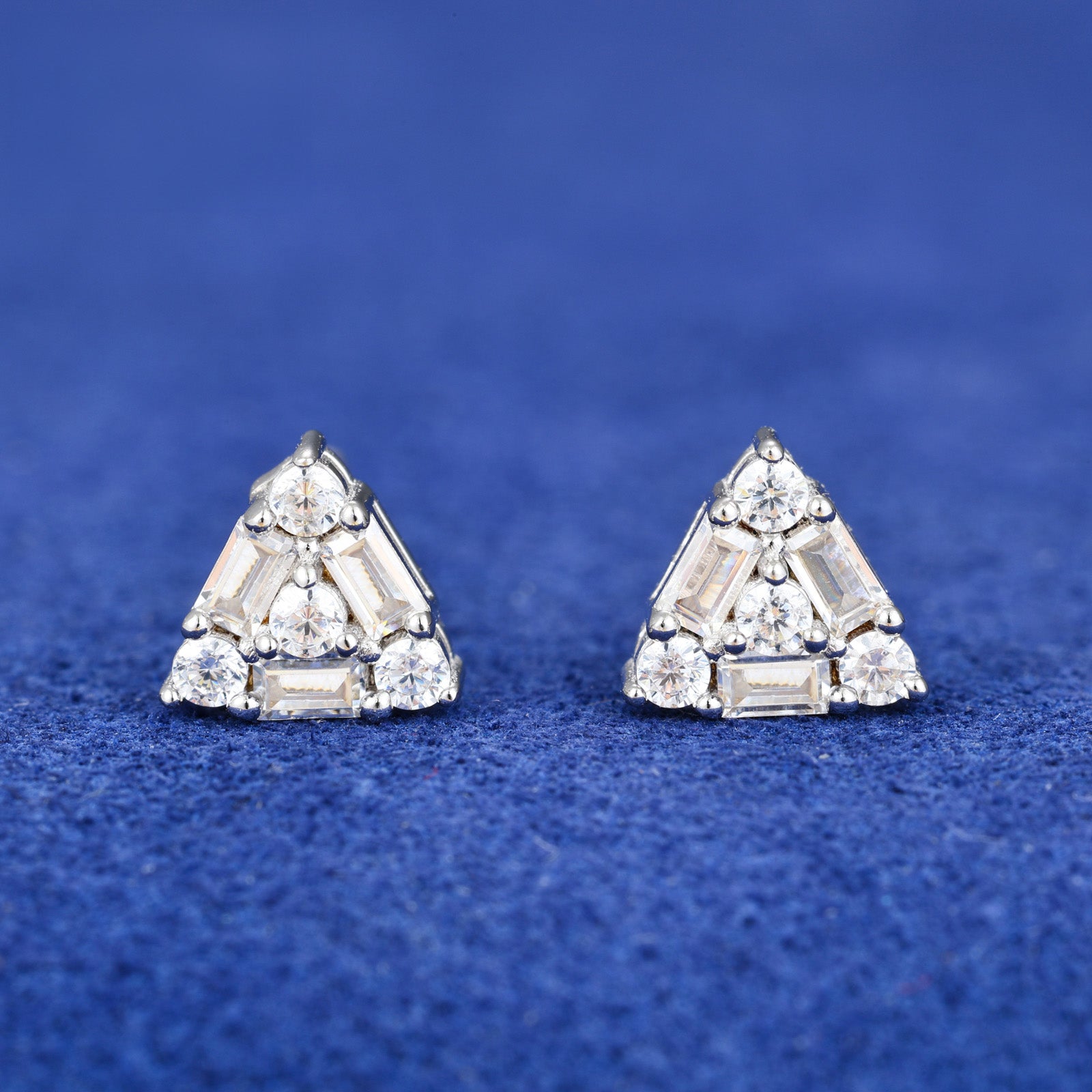 Baguette Moissanite Triangle Stud Earrings: Elevate your style with these geometric studs, featuring sleek baguette-cut moissanite stones arranged in a modern triangle design. Their dazzling and brilliant sparkle make them a standout accessory for any occasion. 🔺✨