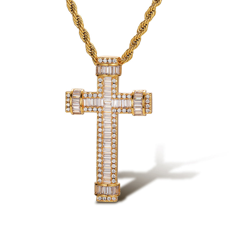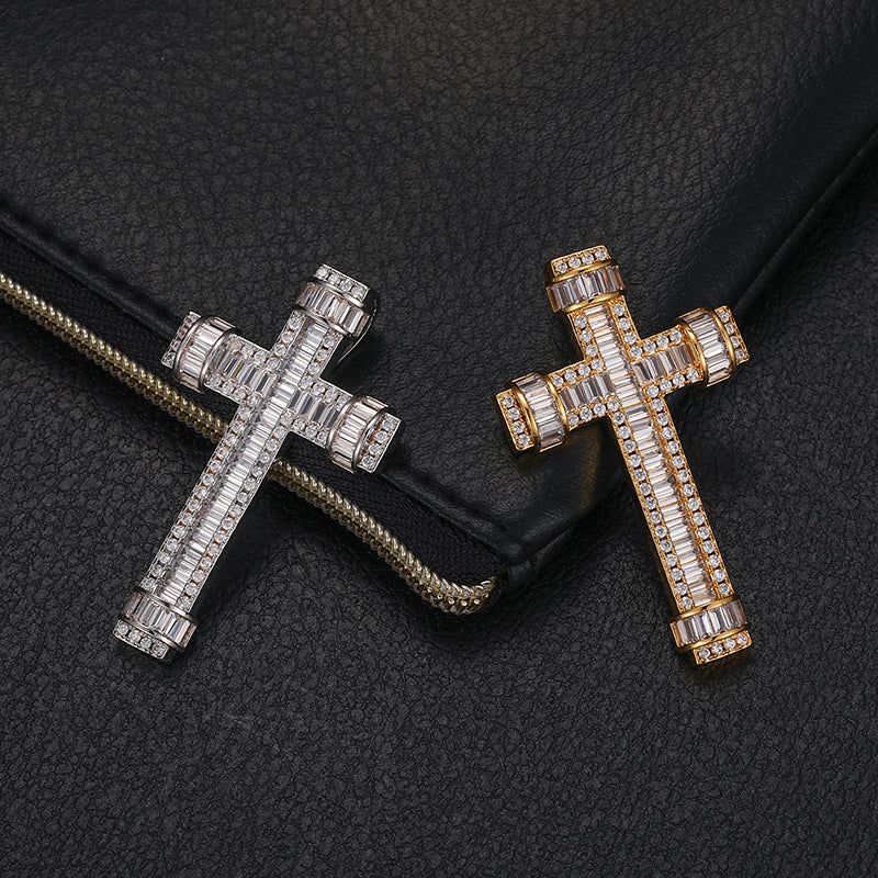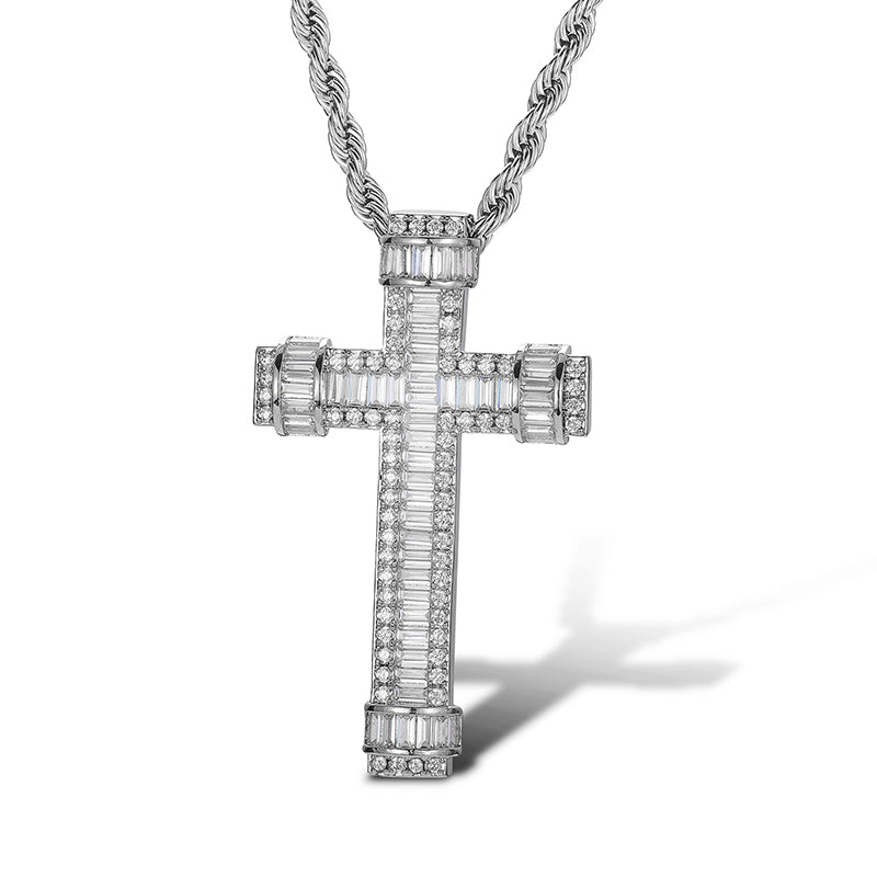 BAGUETTE RINGED MOISSANITE CROSS PENDANT IN STERLING SILVER