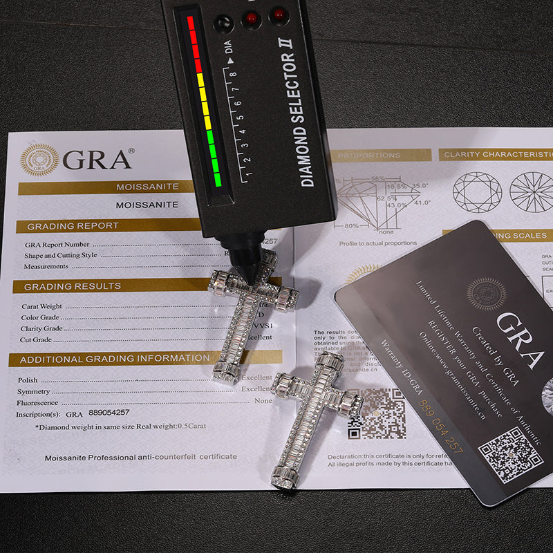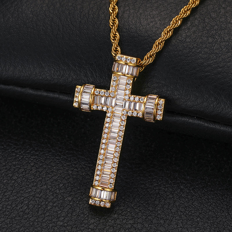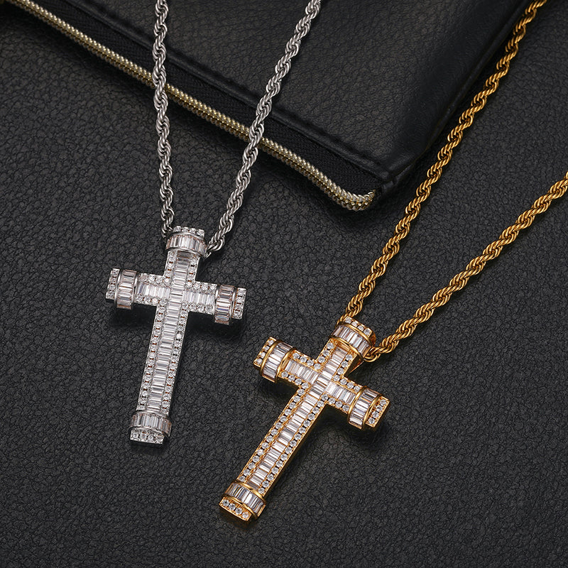 Introducing our Baguette Ringed Moissanite Cross Pendant in Sterling Silver. This elegant pendant features a cross design adorned with sparkling baguette-cut moissanite stones, encircled by a ring of high-quality sterling silver. With its combination of faith and fashion, this pendant adds a touch of sophistication and brilliance to any outfit. Perfect for both everyday wear and special occasions, it's designed to captivate and inspire. Elevate your jewelry collection with this stunning piece that blends timeless elegance with modern flair. 💎✝️