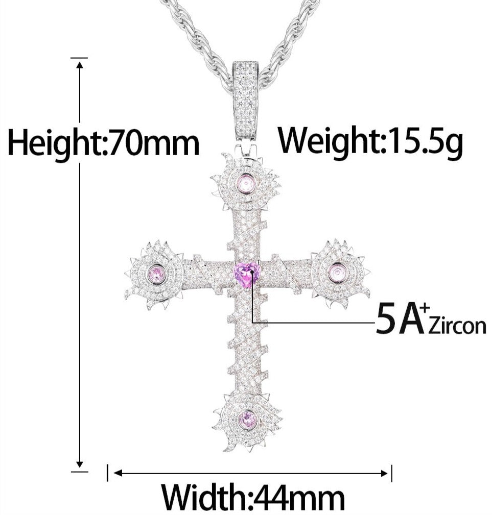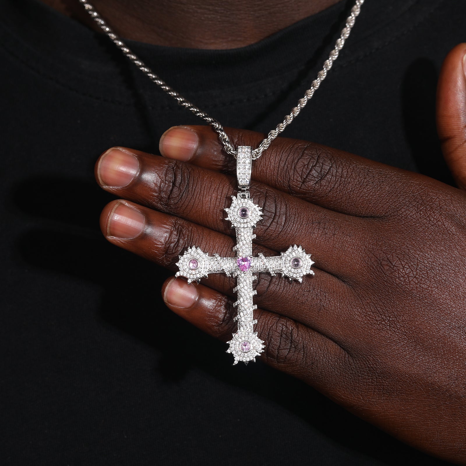 Introducing our Cross Moissanite Thorn Pink CZ Pendant in Sterling Silver, a striking blend of faith and elegance. This unique pendant features a cross design adorned with sparkling moissanite stones and vibrant pink CZ stones, all meticulously crafted from high-quality sterling silver. Perfect for those who appreciate bold and luxurious jewelry, this pendant adds a touch of brilliance and color to any outfit. Elevate your style with this captivating and symbolic accessory. ✝️💎