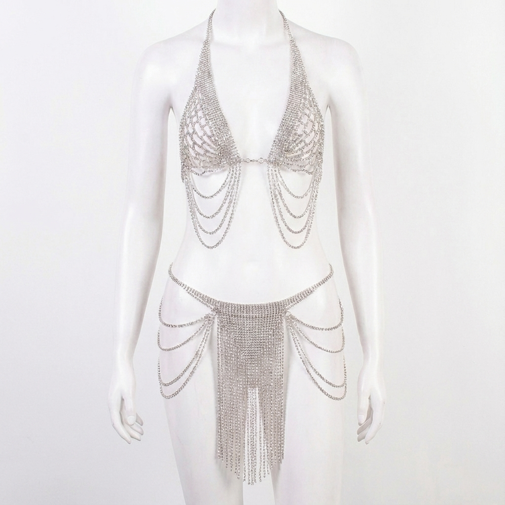 CRYSTAL COUTURE BODY CHAIN SET: A high-glam, statement body jewelry set designed to command attention. Featuring an intricately draped crystal bralette paired with a cascading waist and hip chain, this set sculpts the body with fluid lines and radiant sparkle. The layered design creates dramatic movement while remaining lightweight and comfortable to wear. Perfect for luxury events, photoshoots, festivals, or bold evening looks, this couture-inspired set delivers unapologetic glamour from every angle ✨👑