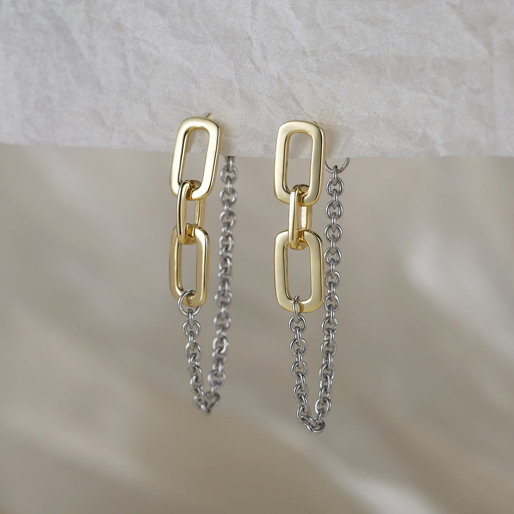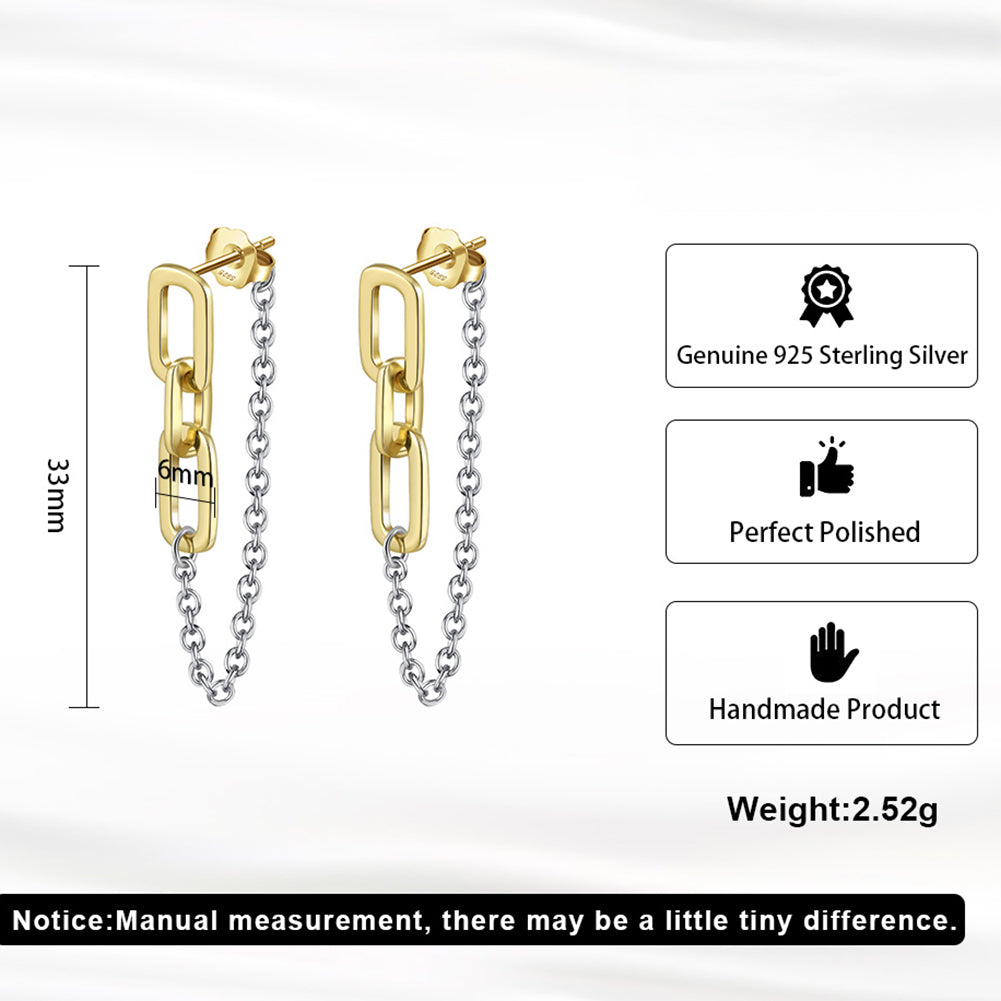 Dual Link Chain Drop Earrings in Sterling Silver: Elevate your style with these contemporary drop earrings, blending sleek rectangular links with delicate chain accents. The mix of polished gold-tone links and sterling silver chains creates a modern two-tone contrast, perfect for both casual and elegant looks. Lightweight and versatile, these earrings add just the right amount of edge and sophistication to your everyday style. ✨💫