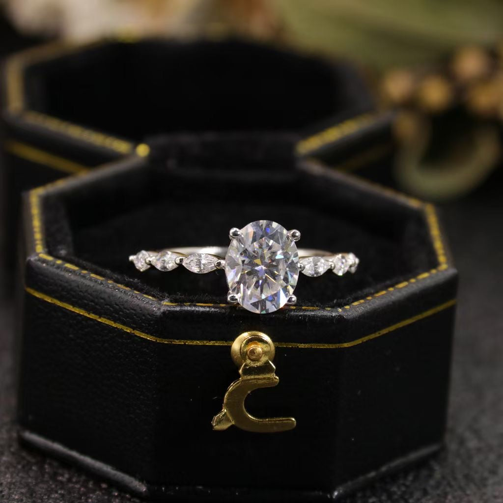Introducing our IE005 Oval-Marquise Cut Eternity Moissanite Engagement Ring in Sterling Silver, featuring a dazzling oval-cut moissanite as the centerpiece, surrounded by marquise-cut stones along the band. Crafted with precision in sterling silver, this ring epitomizes timeless elegance and sophistication, perfect for symbolizing everlasting love and commitment. Ideal for those seeking a ring that blends classic charm with modern allure, designed to sparkle and enchant for a lifetime. Make a statement with this exquisite piece, crafted to celebrate your special bond with brilliance and grace. 💍💎