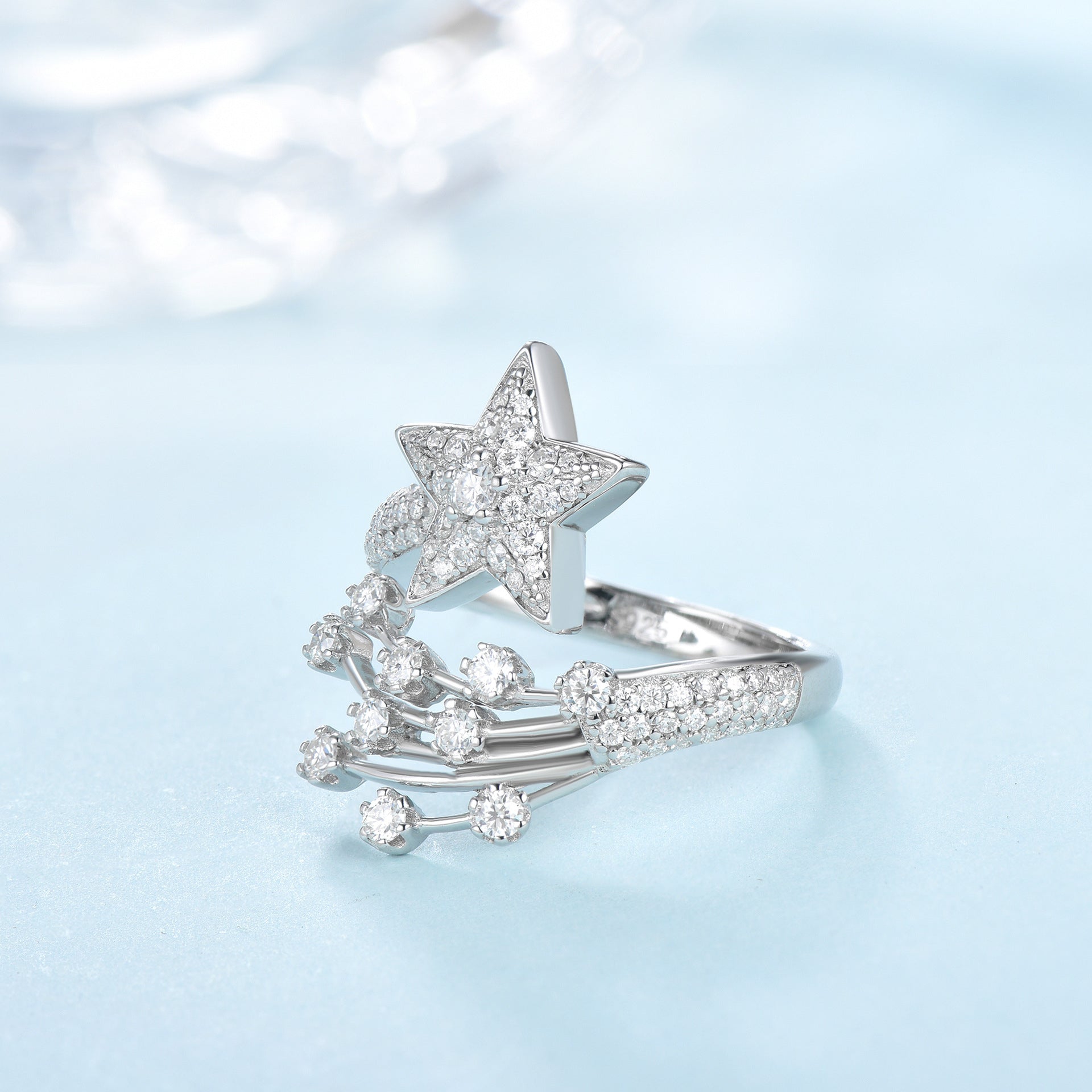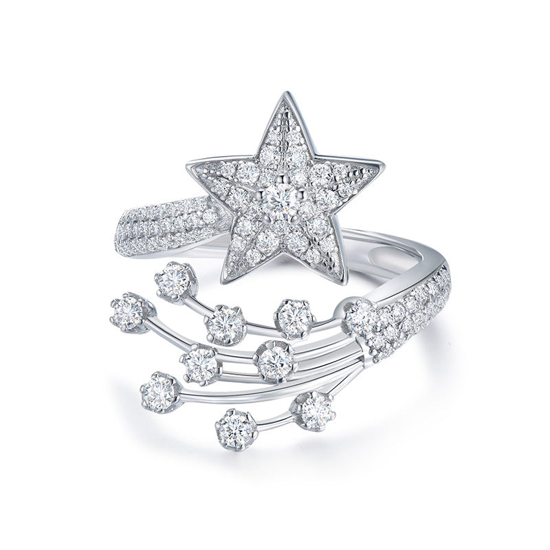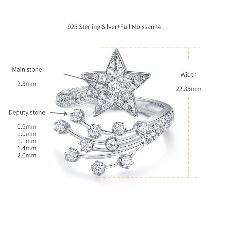 Make a wish upon the IE0228 Star Moissanite Diamond Ring in Sterling Silver. Crafted with precision and adorned with shimmering moissanite stones, this ring features a unique star design that adds a touch of celestial charm to any ensemble. Whether worn as a symbol of hope or a reminder of your dreams, this exquisite ring is sure to capture attention and spark conversation wherever you go. Let your inner light shine bright with this stunning piece of jewelry.