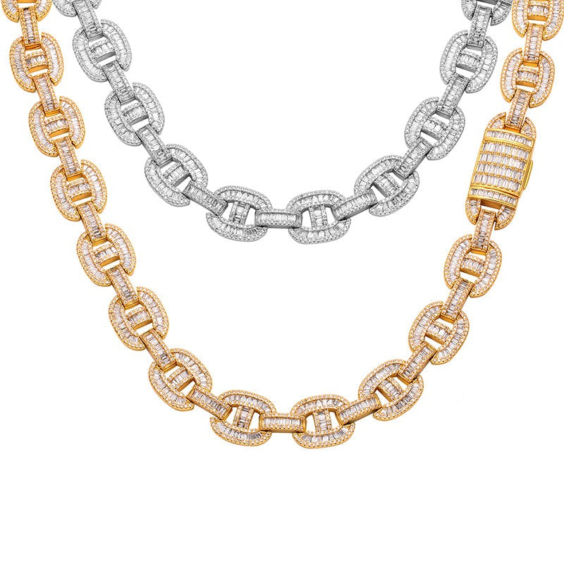 The IE0489 Moissanite Miami Cuban Link Chain Necklace/Bracelet in sterling silver features a bold 15mm width and stunning baguette-cut moissanite stones. This luxurious piece is perfect for making a statement, combining timeless elegance with modern style. Ideal for any occasion, it adds a touch of sophistication and brilliance to your look. 💎✨