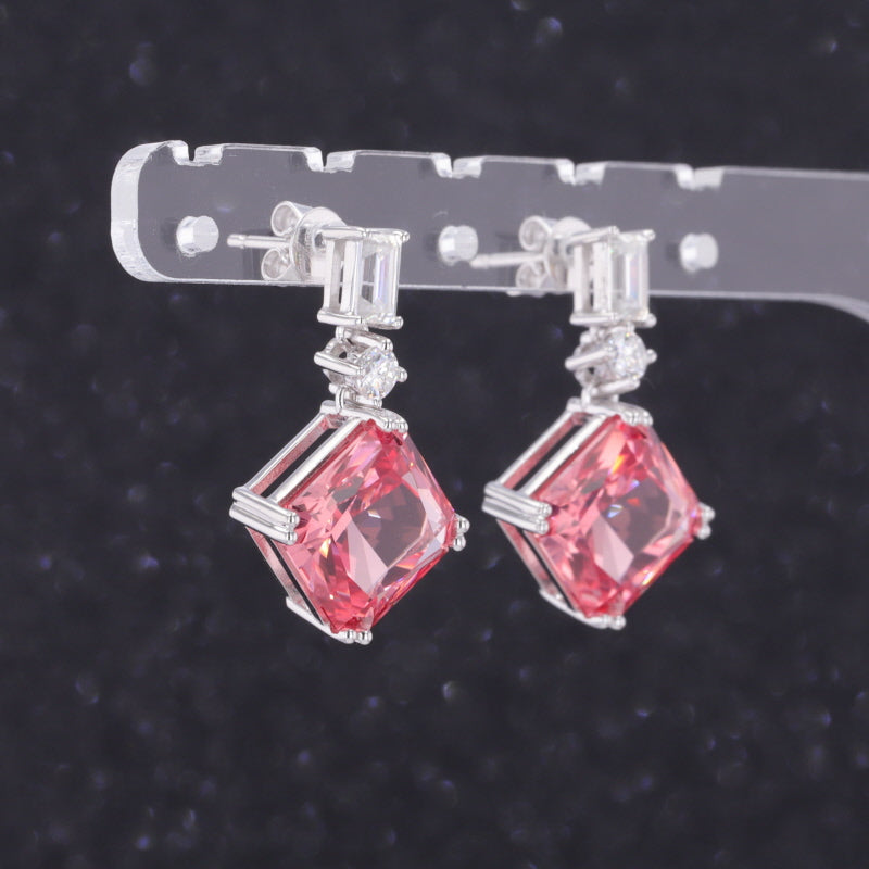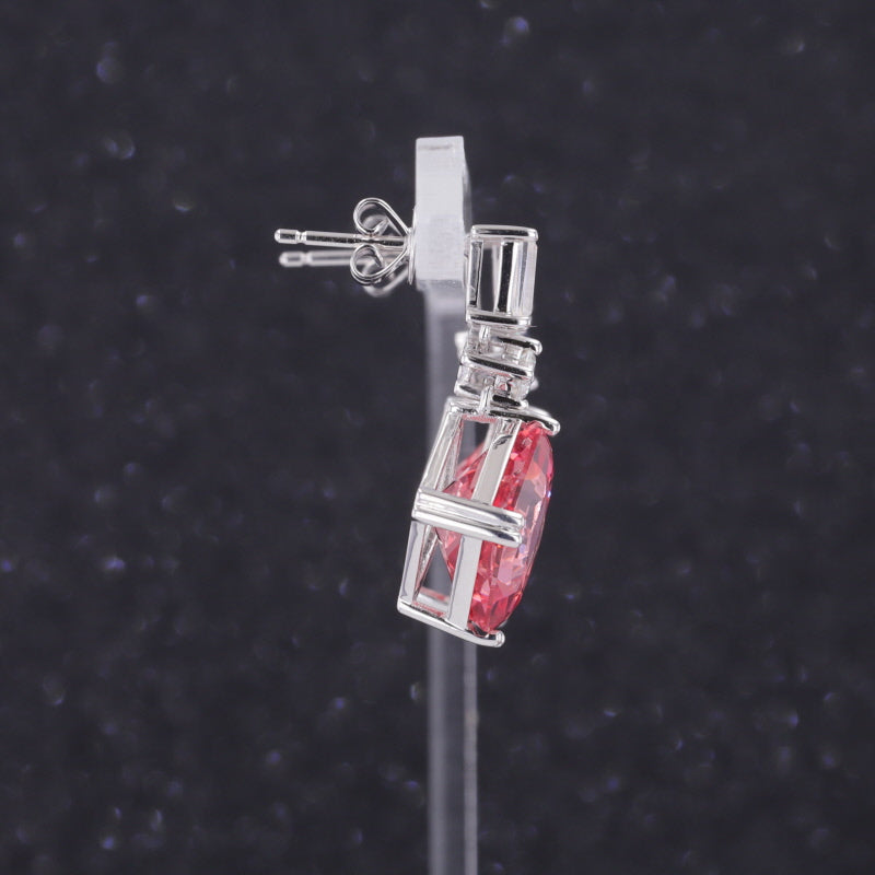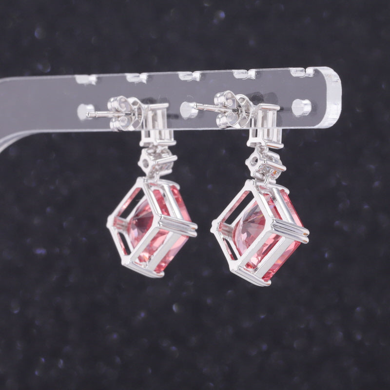 Elevate your elegance with our Asscher Cut Lab Grown Padparadscha Sapphire Dangle Earrings, meticulously crafted in 18K white gold. These exquisite earrings feature striking Asscher cut Padparadscha sapphires, complemented by shimmering moissanite side stones.