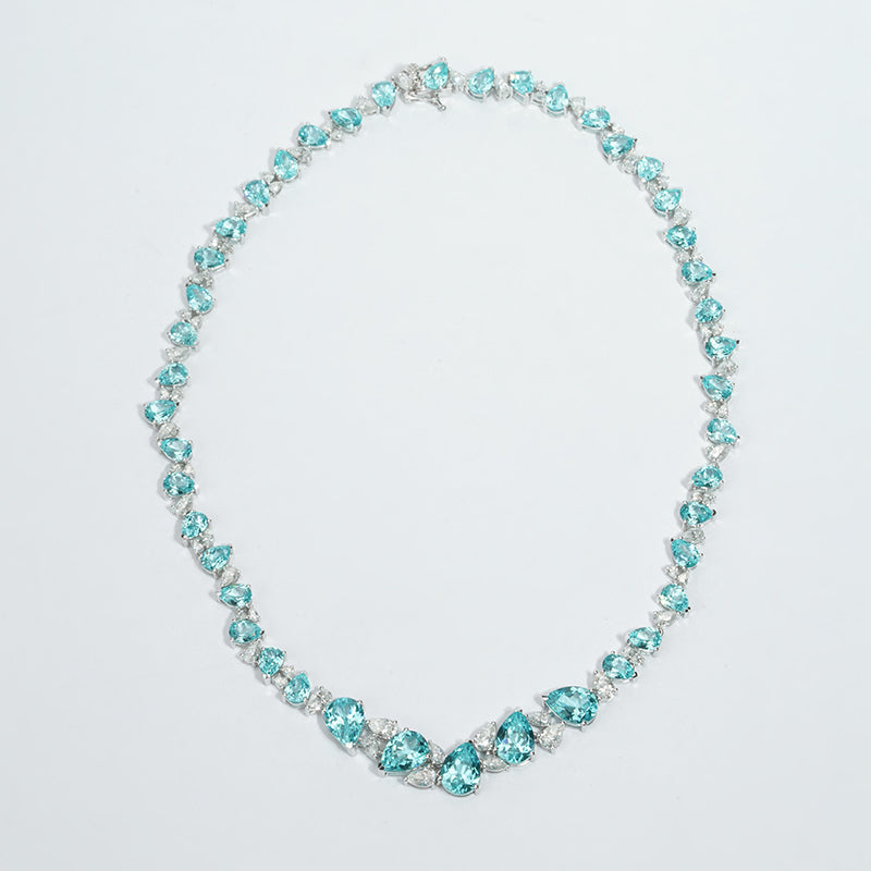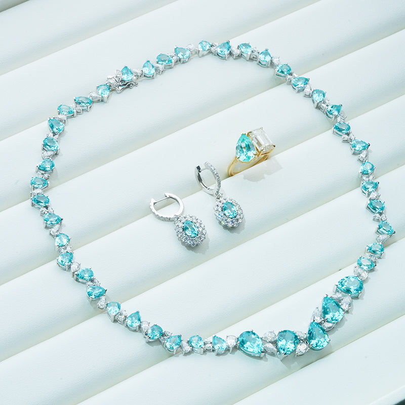 LAB GROWN PARAIBA GEMSTONE AND MOISSANITE JEWELRY SET WITH NECKLACE EARRINGS RING IN 14K WHITE GOLD