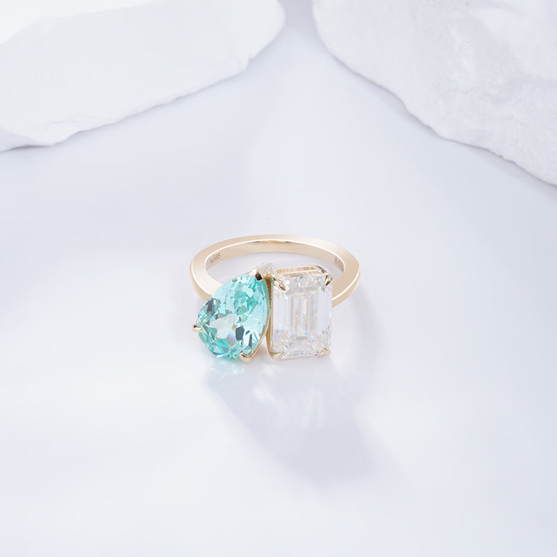 Discover the epitome of luxury with our Lab Grown Paraiba Gemstone and Moissanite Jewelry Set, featuring a necklace, earrings, and ring in exquisite 14K white gold. Perfect for weddings or engagements, the Toi et Moi ring showcases a stunning pear-cut Paraiba gemstone paired with an emerald-cut Moissanite, symbolizing the union of two distinct beauties. The necklace captivates with a pear-cut Paraiba gemstone and a matching pear-cut Moissanite diamond, creating a harmonious blend of colors and brilliance. Completing the set, the earrings feature a central Paraiba gemstone encircled by shimmering Moissanite diamonds, adding a touch of elegance to any ensemble. This set is perfect for those who appreciate the fusion of modern design and timeless sophistication.