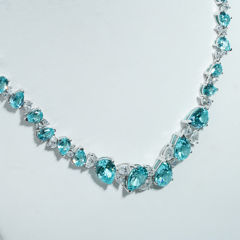 Discover the allure of our Lab Grown Paraiba Sapphire Gemstone and Moissanite Diamond Necklace in 14K Gold. This exquisite piece features vibrant Paraiba color lab sapphire gemstones, complemented by sparkling moissanite diamonds, set in a stunning 17-inch necklace.